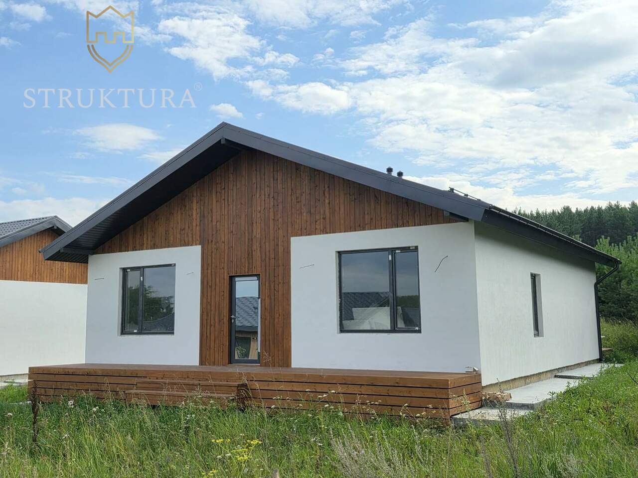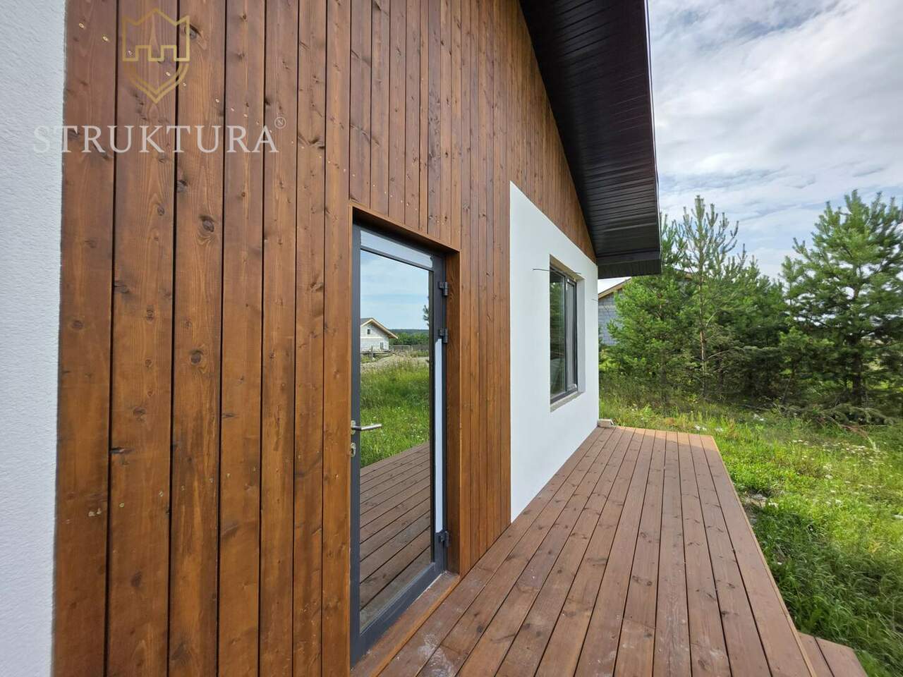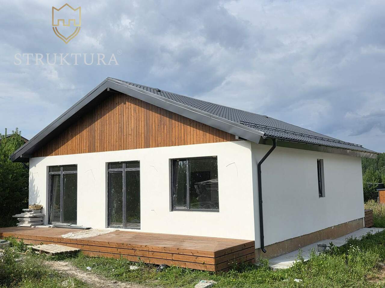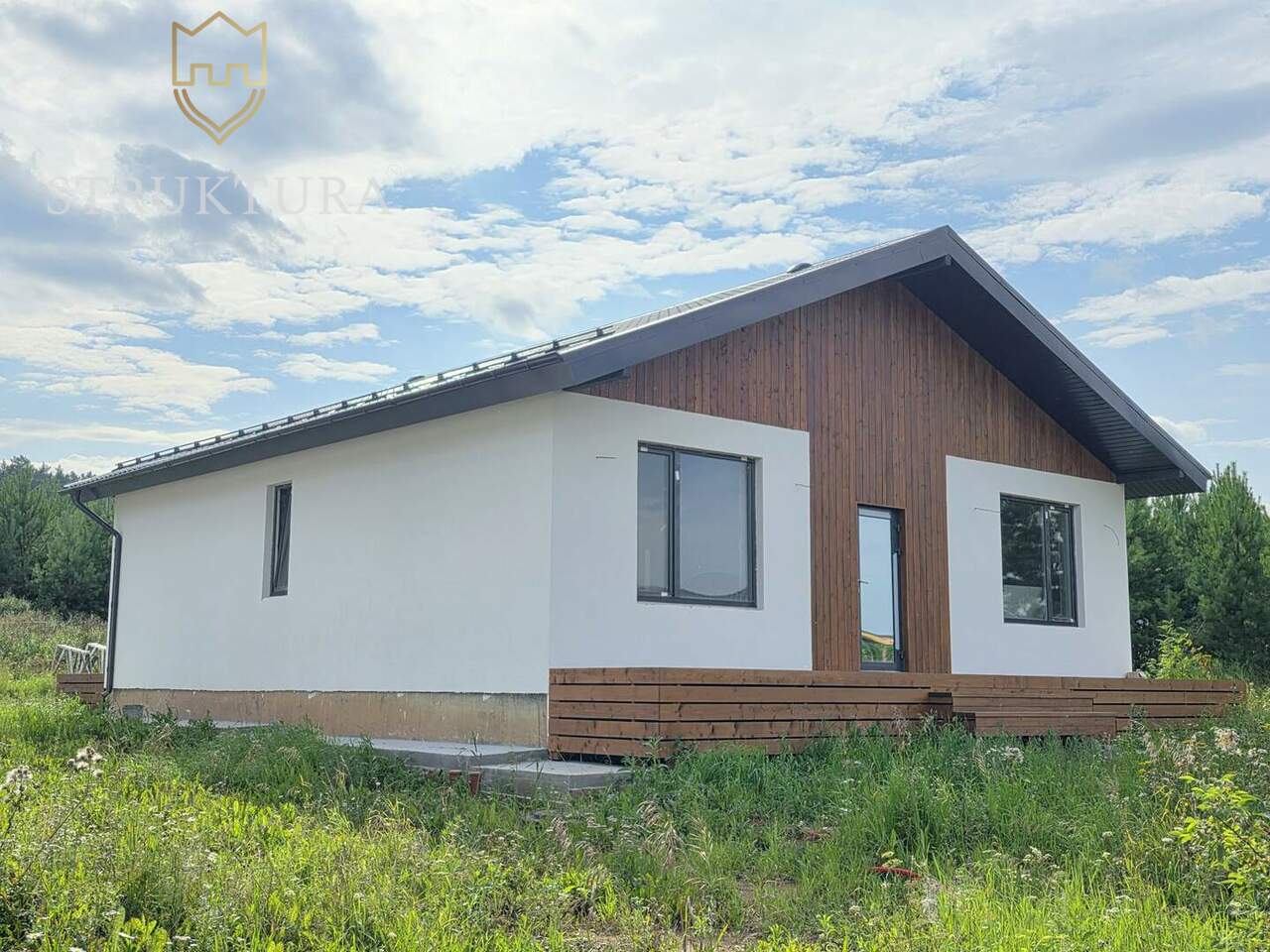 Фасад дома выполнен в светлых тонах и украшен элегантными деревянными элементами. Установлена водосточная система и снегозадержатели, а так же залита бетонная отмостка по периметру дома.