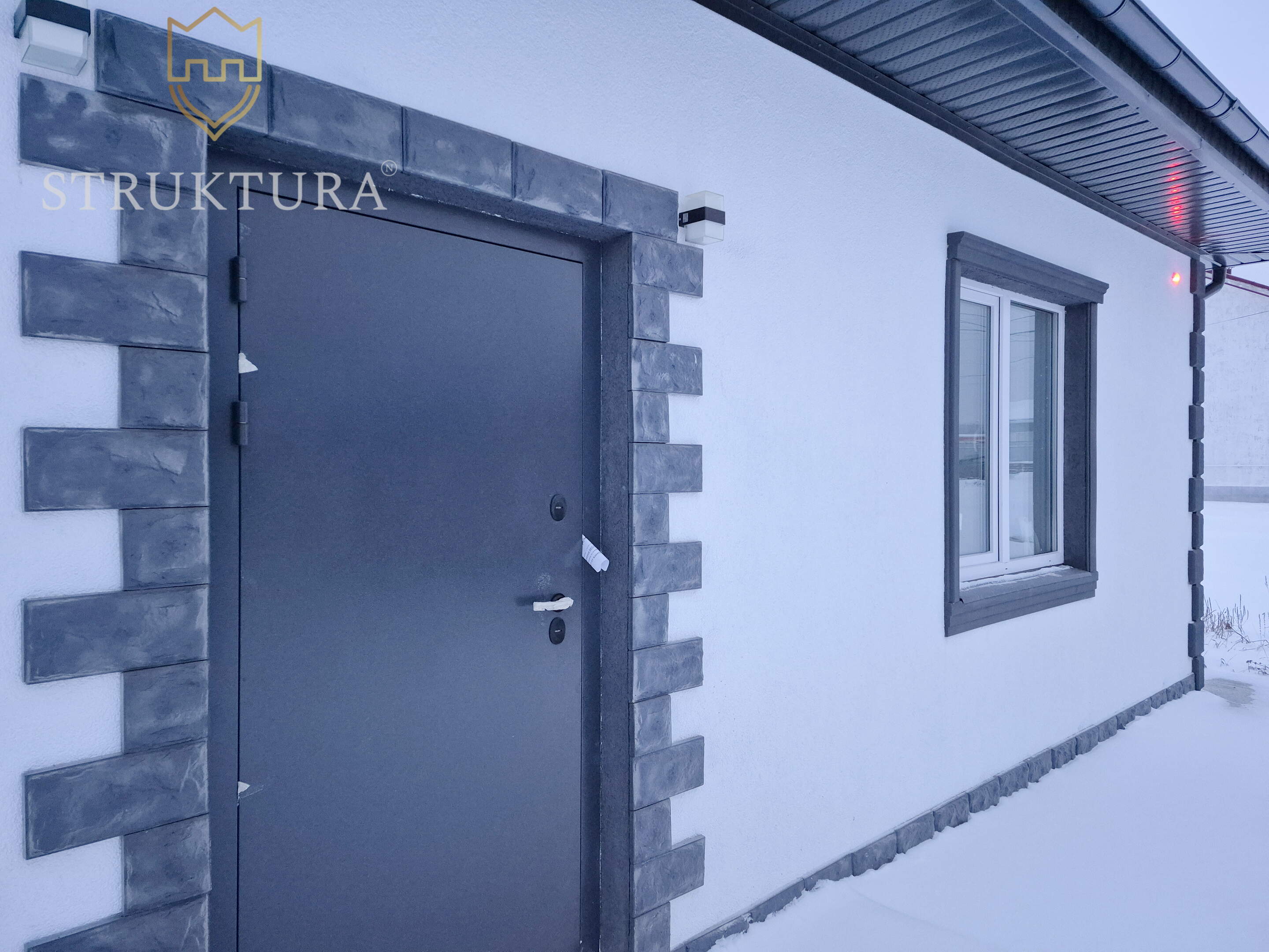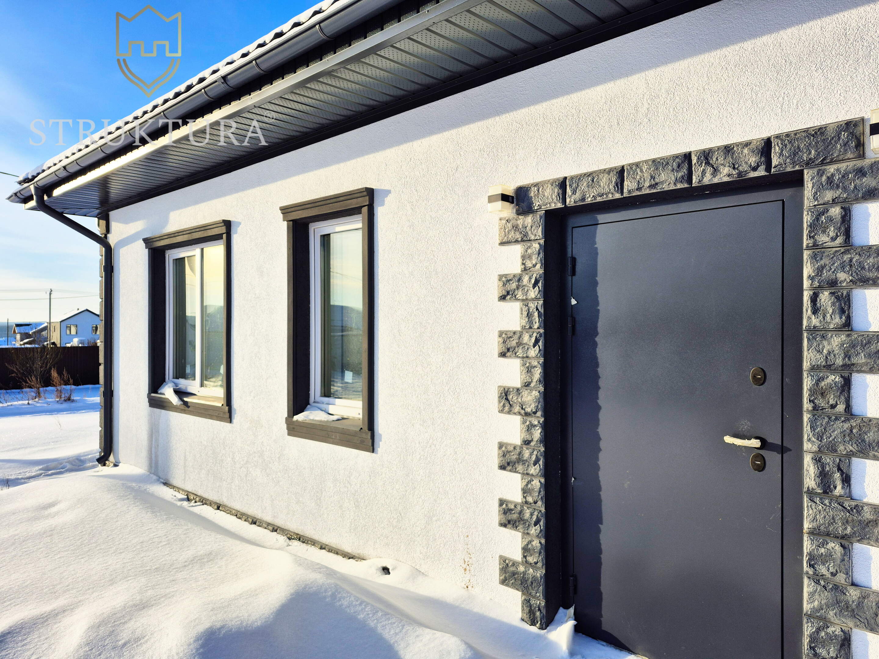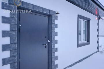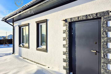Фасад выполнен из светлой фактурной штукатурки в сочетании с наличниками серого цвета и отделкой декоративным камнем по всему периметру. Крыльцо для удобства оборудовано ровной, железобетонной площадкой. Крыша дома покрыта металлочерепицей серого цвета – все это вместе придает дому стильный и индивидуальный внешний вид.