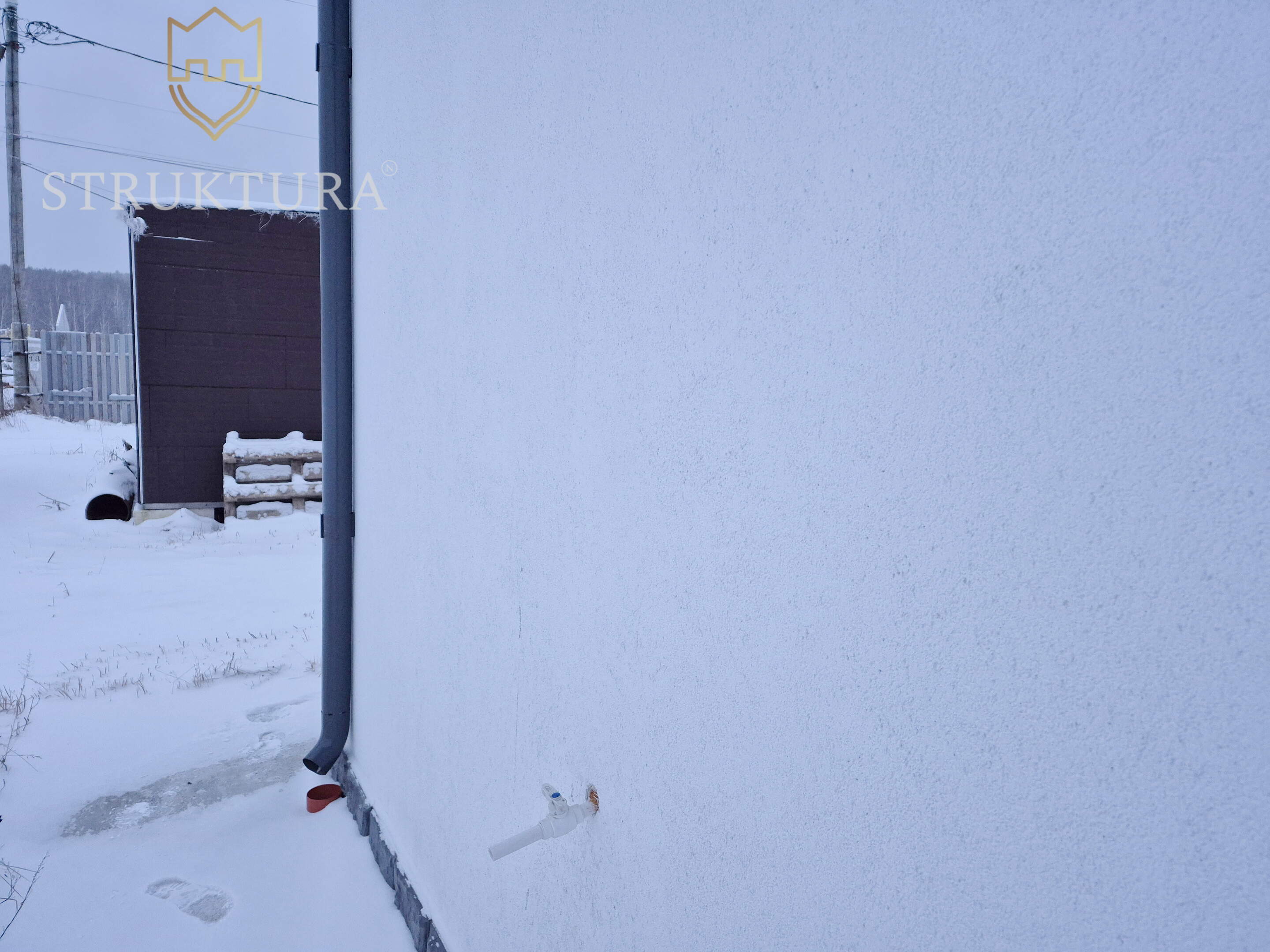 На фасад дома выведен наружный водопровод для удобства набора воды и полива.
