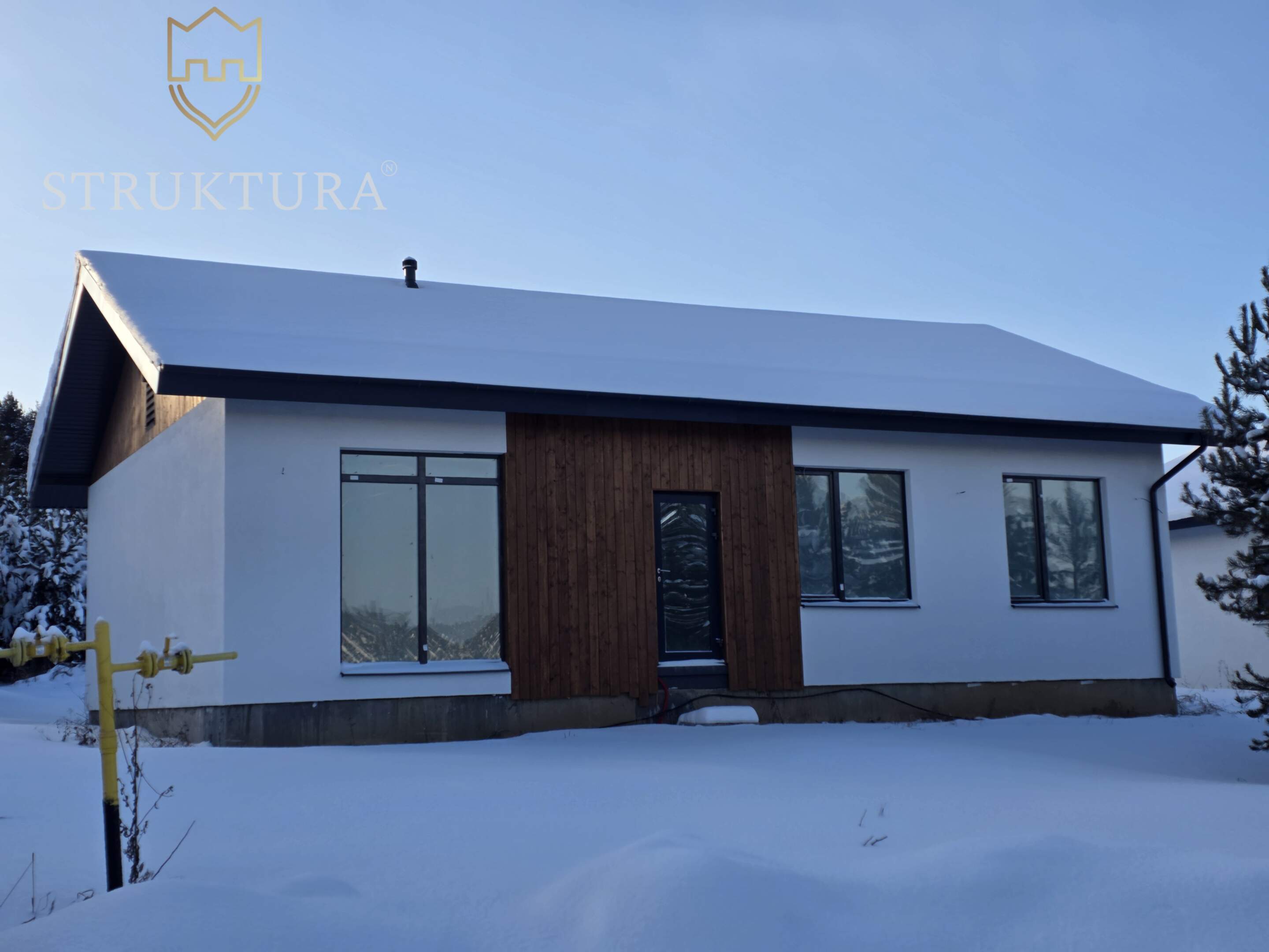 Фасад дома выполнен в светлых тонах и украшен элегантными деревянными элементами. Установлена водосточная система и снегозадержатели, а так же залита бетонная отмостка по периметру дома.
