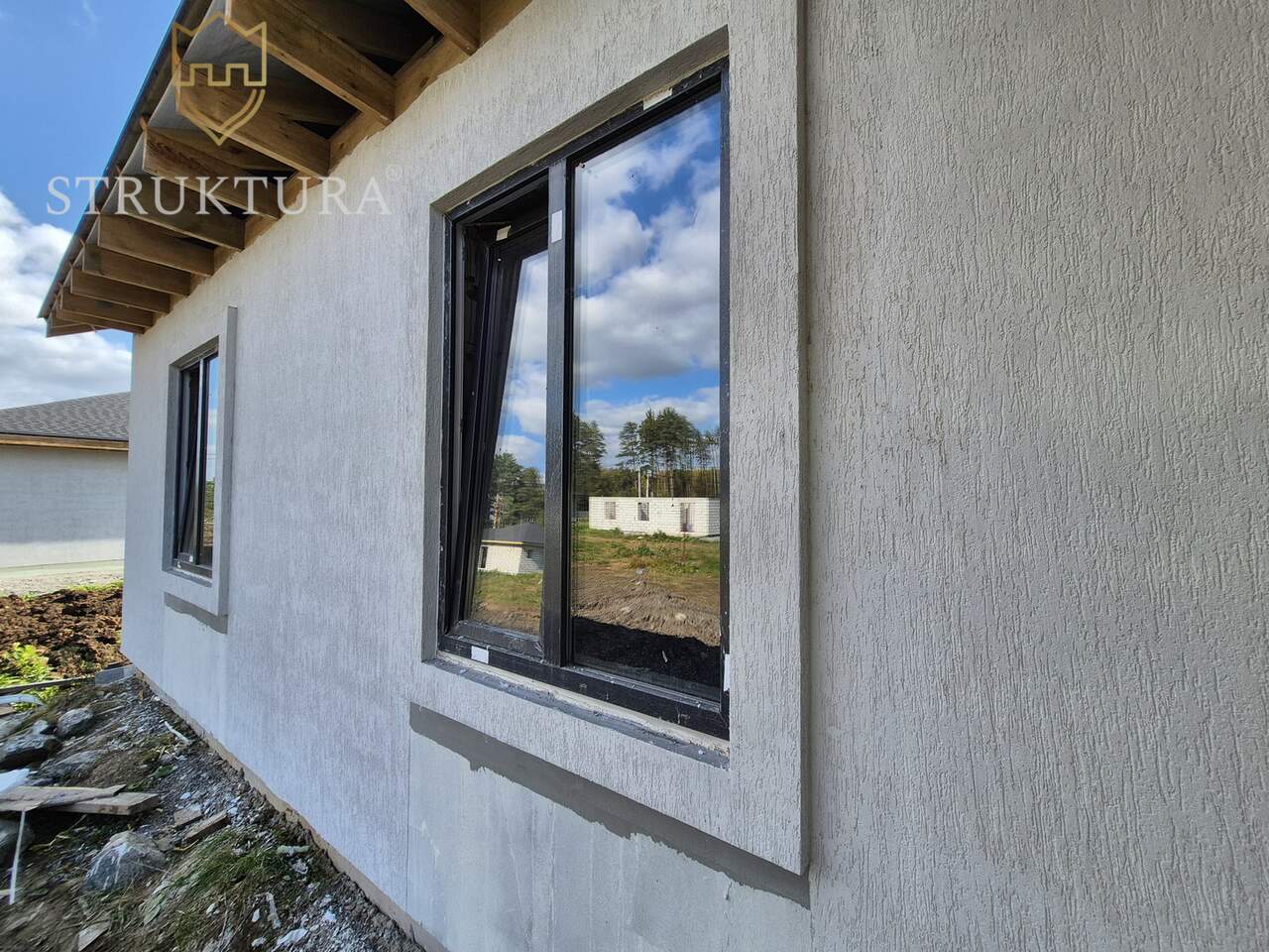 Дом построен из качественных материалов. Фундамент по периметру дома оборудован отмосткой, обустроена наружная водосточная система. Стильный и практичный фасад отделан светлой штукатуркой в сочетании с каменными вставками серого цвета с легкими вкраплениями зеленого оттенка. Крыльцо располагается под общей крышей дома, что надежно защищает от осадков и непогоды. Крыша выполнена из текстурной кровли серого цвета — все это вместе придает дому стильный и современный внешний вид.
