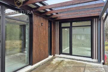 Дом построен из качественных материалов, на высоком монолитном фундаменте. Обустроена наружная водосточная система. Современный и практичный фасад отделан штукатуркой бежевого цвета в сочетании с дизайнерскими элементами, выполненными из древесины орехового цвета. Крыльцо располагается под общей крышей дома и оборудовано ступенями. Оконные проемы оборудованы стеклопакетом с напылением, что позволяет снизить до минимума нагрев в помещении от попадания прямых солнечных лучей в жаркую погоду. Крыша дома покрыта фальцевой кровлей серого цвета и оборудована снегозадержателями — все это вместе придает дому стильный и современный внешний вид.