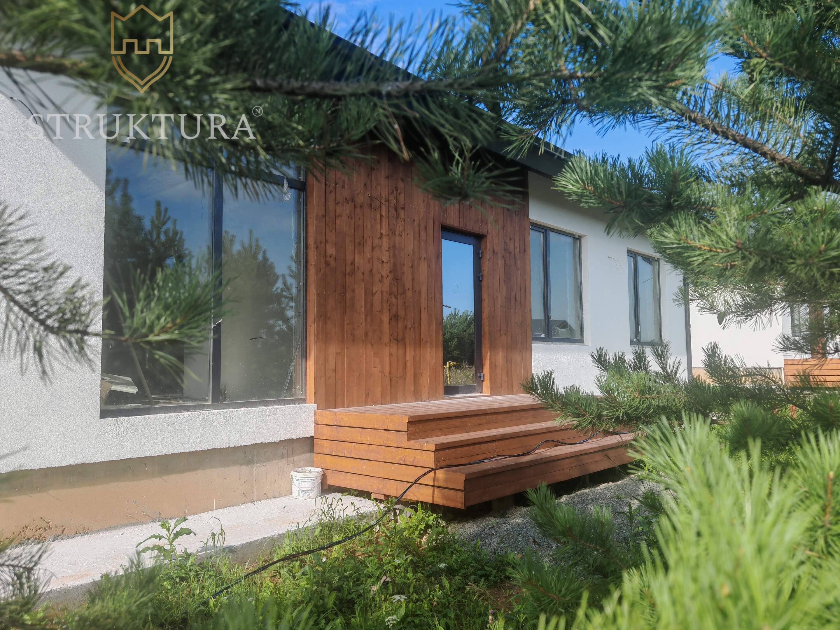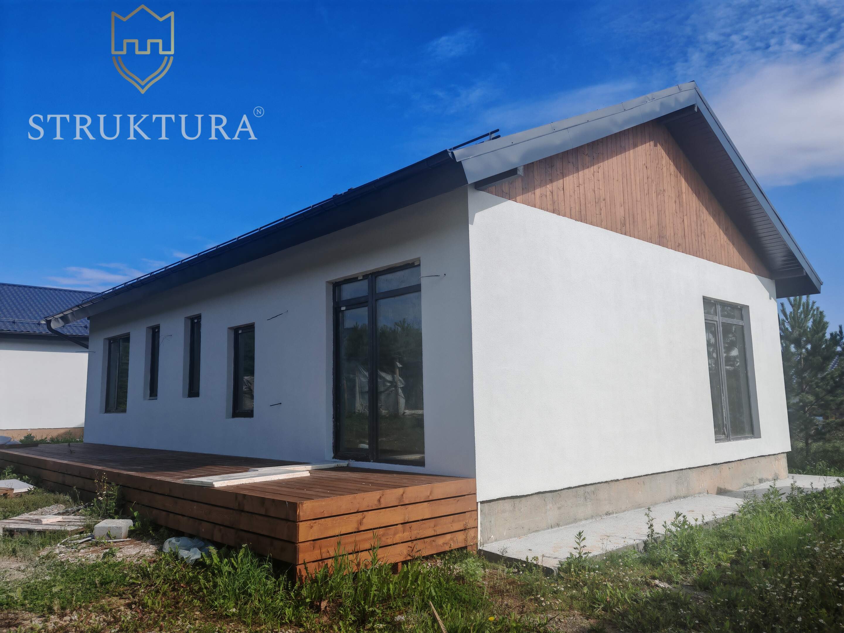 Фасад дома выполнен в светлых тонах и украшен элегантными деревянными элементами. Установлена водосточная система и снегозадержатели, а так же залита бетонная отмостка по периметру дома.