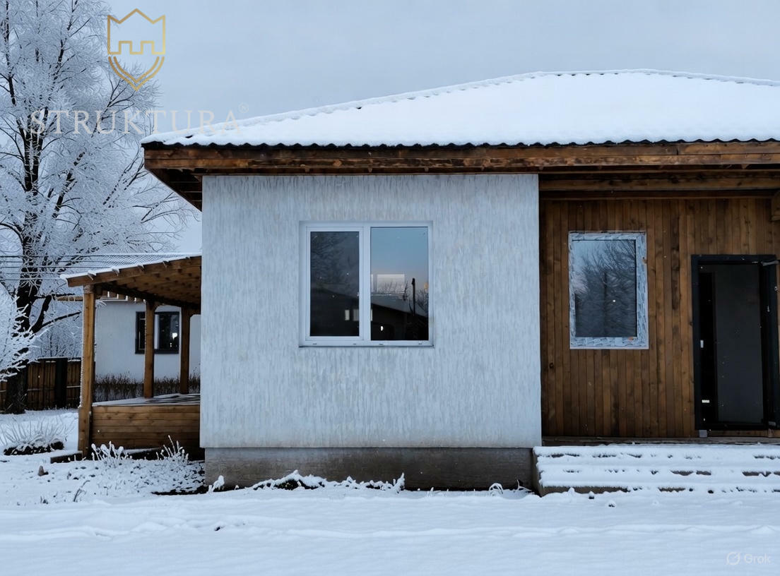 Фасад дома оформлен в элегантной чёрно-белой гамме с использованием декоративной штукатурки. Контрастное сочетание чёрного и белого цветов изящно гармонирует с элегантными деревянными элементами, которые украшают весь периметр здания. Надёжная металлочерепица обеспечивает защиту от любых погодных условий.