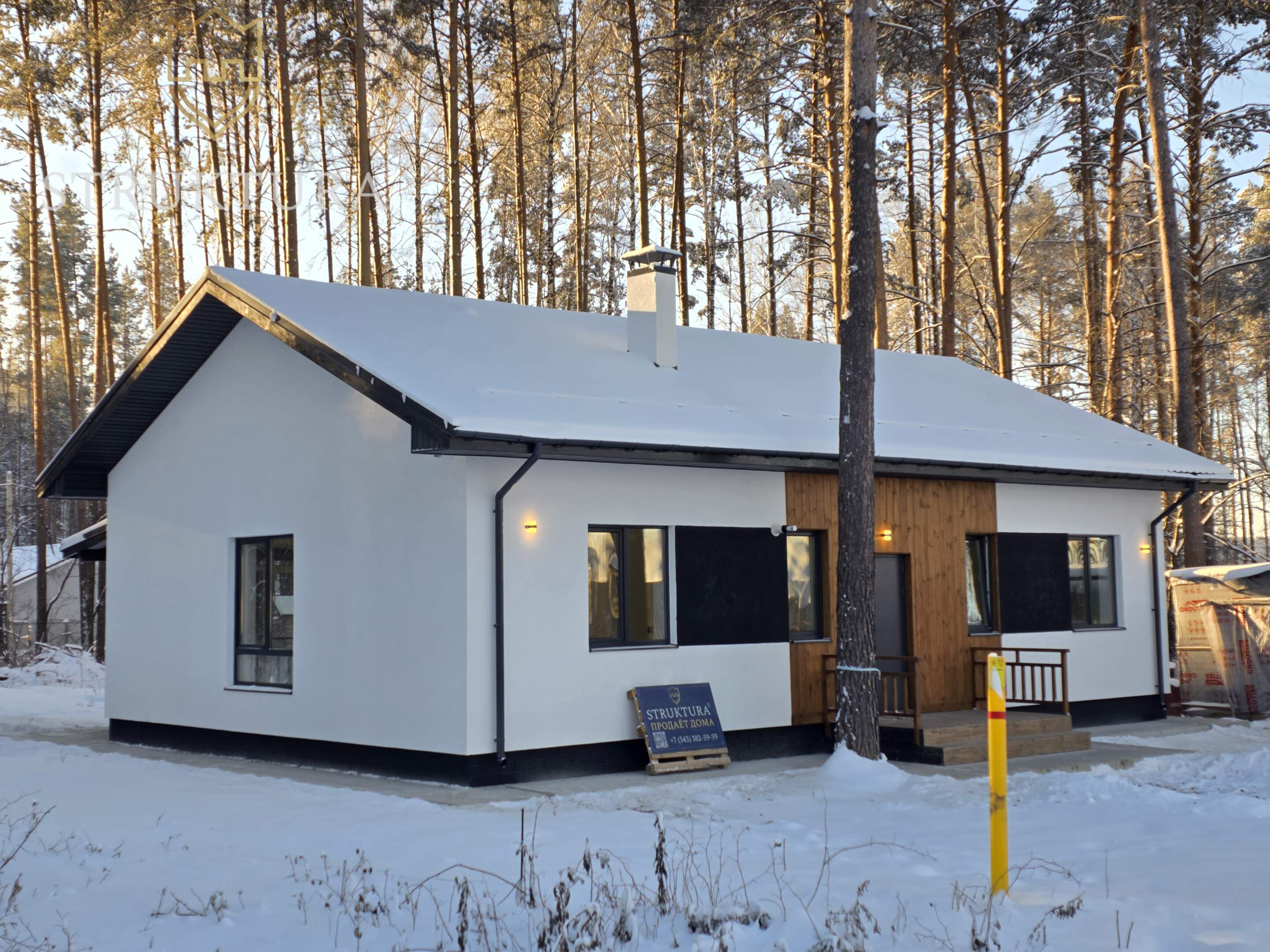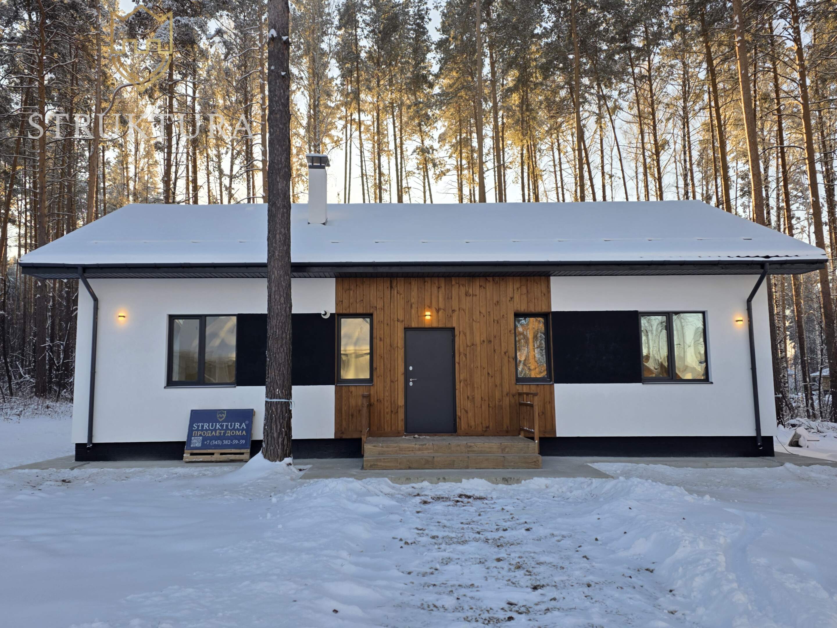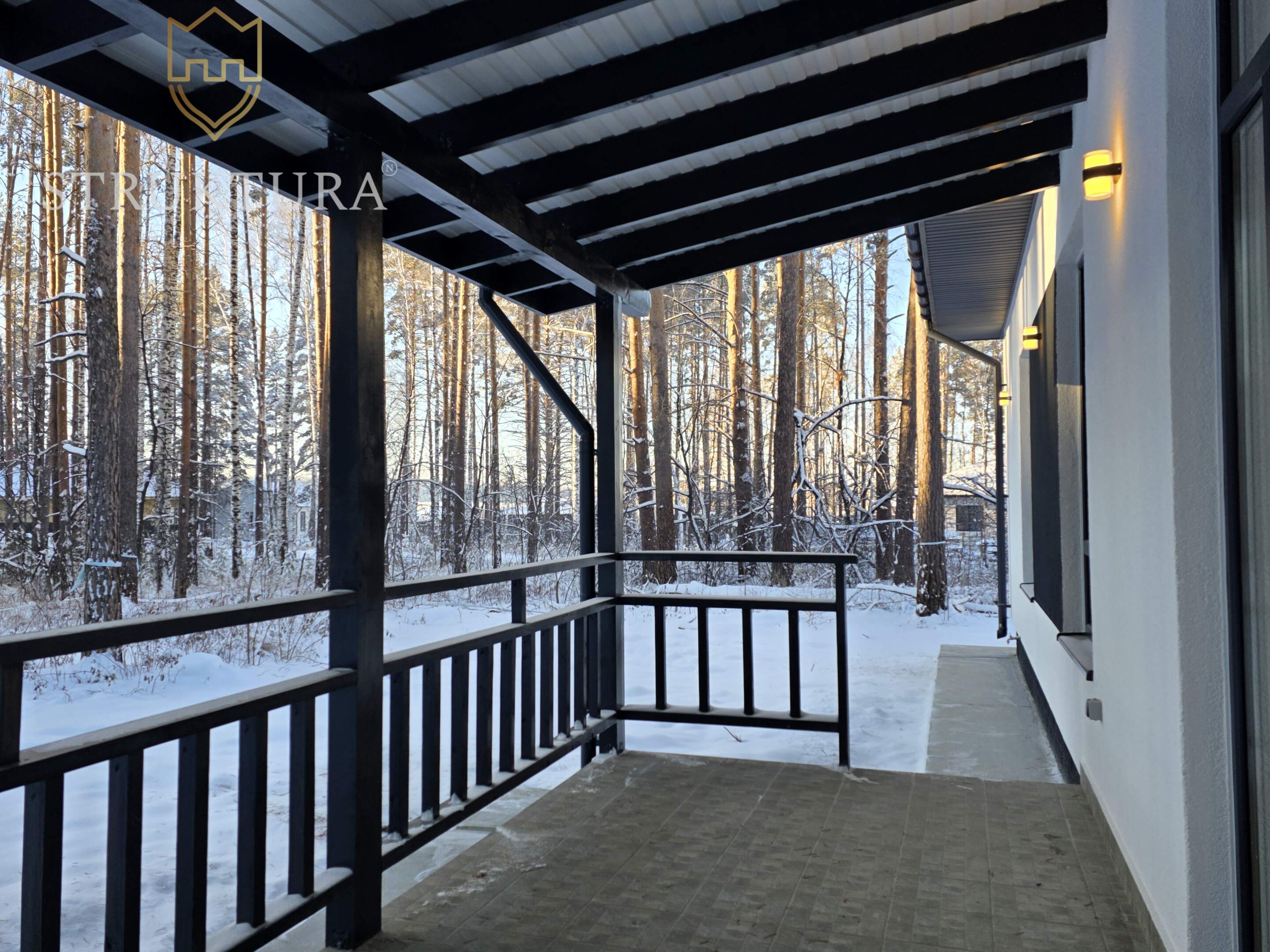 Уже при первом взгляде на дом привлекает его незаурядная архитектура. Входная группа обшита деревянным планкеном, что делает его частью окружающей природы. Покрытие кровли выполнено металлочерепицей серого цвета в тон с окнами, на кровле установлена система снегозадержателей. Просторное крыльцо со ступенями и ограждением приглашает пройти в дом. Крытая терраса — идеальное место для отдыха на свежем воздухе в любую погоду. Наслаждайтесь живописными видами на свой участок, устраивайте уютные вечера с семьей или встречайтесь с друзьями. Надежное ограждение террасы обеспечит безопасность детей и удобство в эксплуатации, а также добавляет уютных штрихов в общую декоративную отделку.