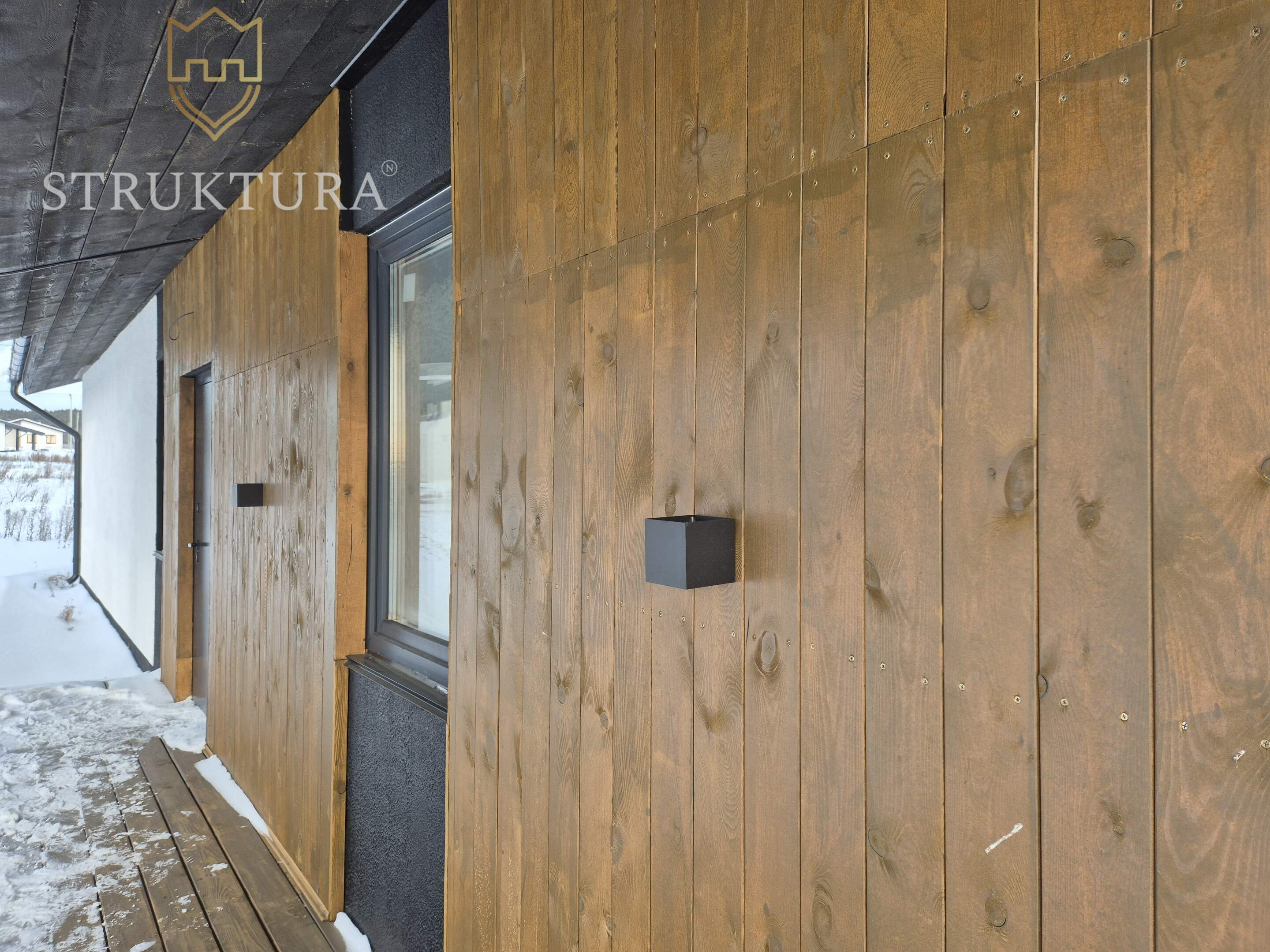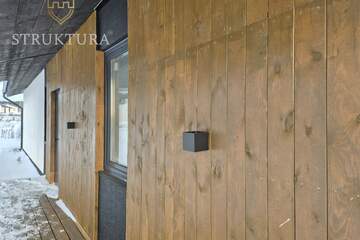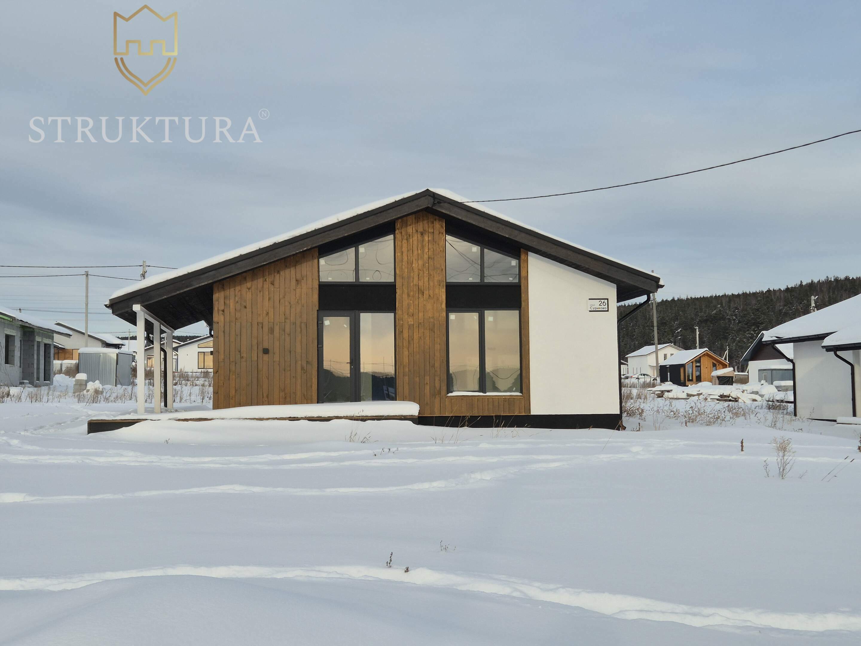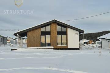 Уже при первом взгляде на дом привлекает его интересная архитектура. Входная группа обшита деревянным планкеном. Покрытие кровли выполнено металлочерепицей серого цвета в тон с окнами, на кровле установлена система снегозадержателей и водосточная система. Терраса — идеальное место для отдыха на свежем воздухе в любую погоду. Фасад дома выполнен в сочетании штукатурки и натурального дерева.
