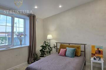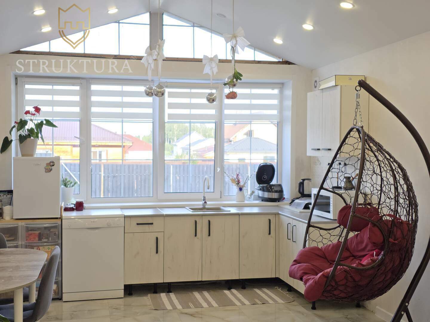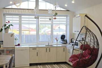 Этот дом — уютное гнездышко для счастливой семьи с детьми. Построен с любовью из качественных материалов. При входе вас встретит просторная прихожая, где найдется место для хранения всей семейной обуви и одежды. В левой части дома расположены две уютные спальни для детей и взрослых, а в конце коридора — совмещенный санузел. В центре дома находится просторная гостиная с кухней, где вся семья может собираться вместе, общаться и проводить время. Мечта хозяйки — отдельное помещение прачечной и кладовой, вход в них есть с улицы, что облегчает ведение домашнего хозяйства. В правой части дома — третья спальня, которая отлично подойдет для ребенка или гостя, и комната отдыха с сауной и душевой, где можно расслабиться и восстановить силы после насыщенного дня. В спальнях и кухне-гостиной реализован потолок под самую крышу, такое решение дает много простора и воздуха.