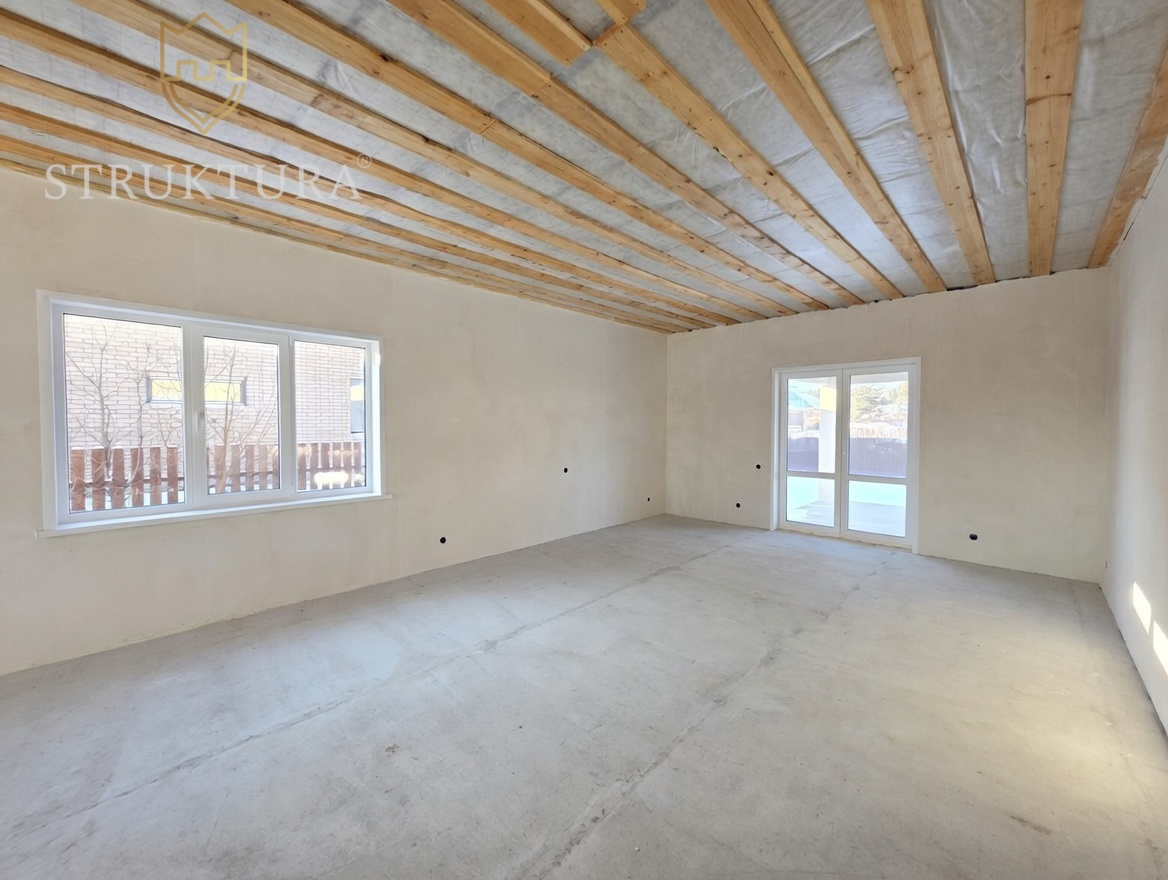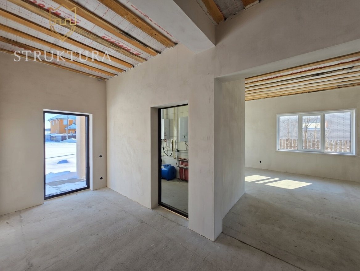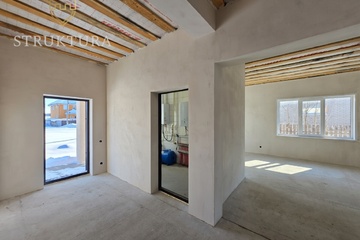 Вас встретит просторное крыльцо под крышей — ступени надёжно укрыты от дождя и снега. В прихожей хватит места для всей семьи: здесь удобно разместить шкаф купе, обувь и верхнюю одежду. Из прихожей вы проходите в котельную — она расположена так, чтобы в любой момент можно было проверить систему отопления или достать нужные хозяйственные принадлежности. Дом словно создан для семьи с детьми. Три просторные спальни — для вас и ваших детей. А если состав семьи только растёт, третья комната может стать кабинетом, гостевой или творческой мастерской. Сердце дома — единое пространство кухни гостиной. Оно ориентировано на три стороны света, поэтому в течение дня комнаты наполняются солнечным светом: утром — тёплым и нежным, днём — ярким и живым, вечером — золотистым и умиротворяющим. Здесь вы собираете всю семью за большим столом: дети с аппетитом едят завтрак перед школой, а по выходным все вместе готовят пироги и делятся планами на день. Из гостиной вы выходите на большую бетонную террасу под единой крышей дома. Здесь можно устроить: утренние чаепития, обеды на открытом воздухе, пока дети играют поблизости, вечерние посиделки с тёплыми пледами и какао, наблюдая, как солнце садится. Терраса защищена крышей, поэтому отдыхать здесь можно в любую погоду: и в лёгкий дождик, и под первыми снежинками.