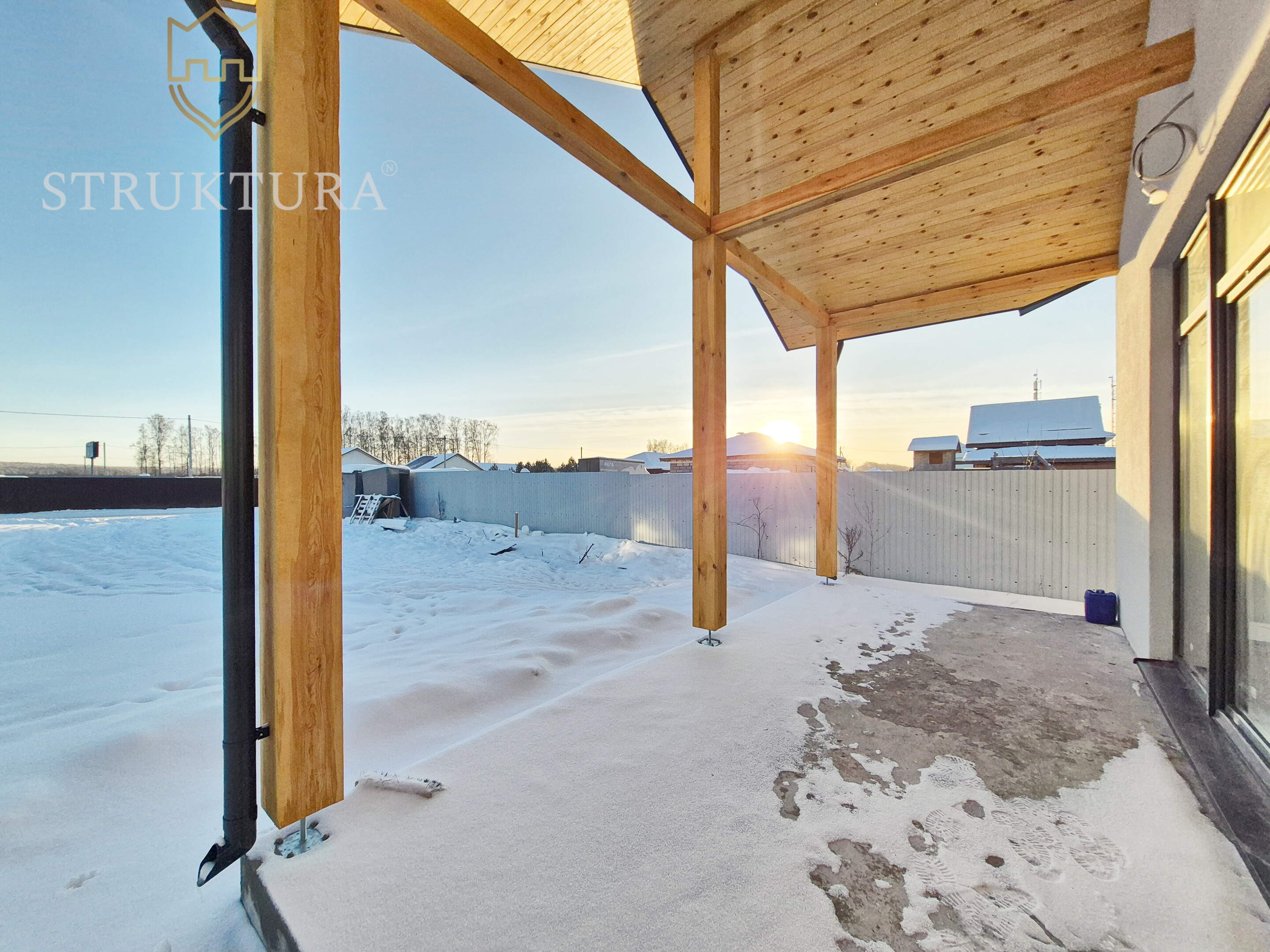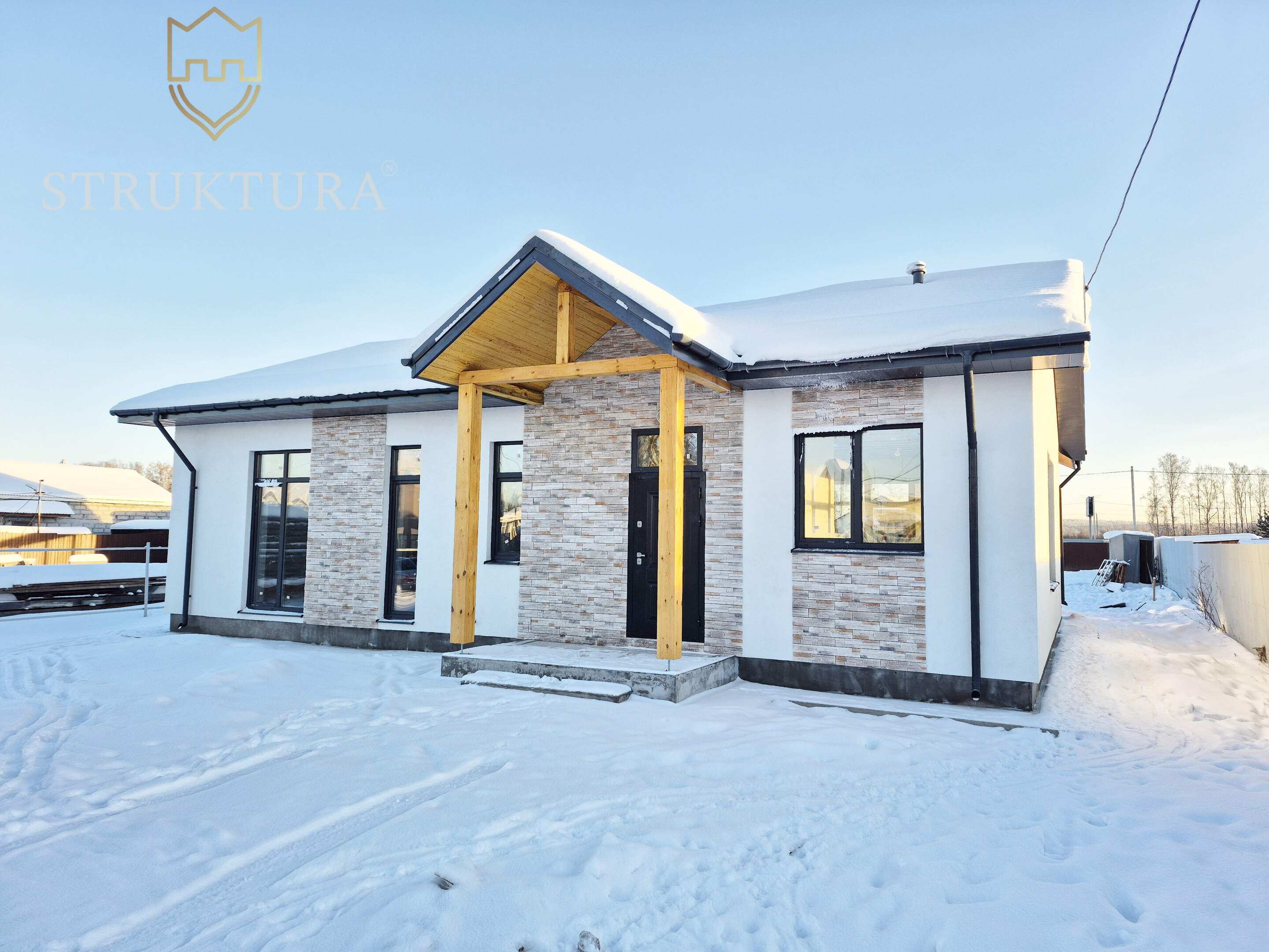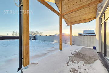 Дом построен из качественных материалов, стоит на высоком фундаменте, защищённом отмосткой. Стильный и практичный фасад отделан штукатуркой кремового цвета в сочетании с элементами из декоративного кирпича. Крыльцо находится под отдельной крышей, которая изнутри отделана деревом, оно оборудовано удобными монолитными ступенями. Входная группа выполнена из массивного бруса с интерьерным деревянным коньком. Крыша покрыта скатной кровлей серого цвета - всё это вместе придает дому стильный и современный внешний вид. Просторная терраса, обрамлённая столбами из толстого бруса, находится под общей крышей дома, она также оборудована ступенями для удобства спуска и подъема. Имеется водосточная система и снегозадержатели.
