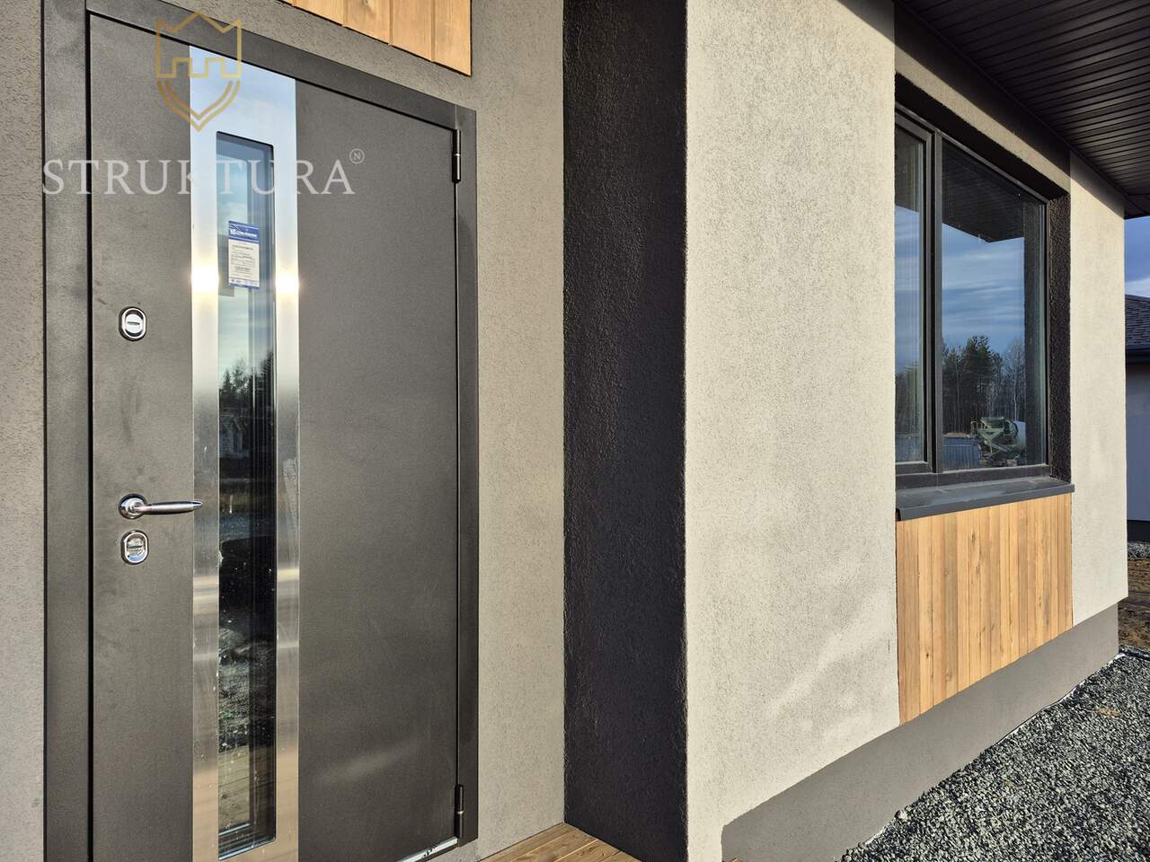 Дом построен из качественных материалов, на утеплённом монолитном бетонном фундаменте. Обустроена наружная водосточная система. Крыльцо располагается под общей крышей дома и оборудовано ступенями. Входная группа декорирована планкеном. Современный и практичный фасад отделан фактурной штукатуркой «Короед» серого цвета со вставками из древесного планкена в сочетании с оконными рамами чёрного цвета. Крыша дома покрыта кровлей из металлочерепицы и оборудована снегозадержателями — всё это вместе придает дому стильный и современный внешний вид. Оборудована система приточной-вытяжной вентиляции. Установлены энергосберегающие стеклопакеты с нанонапылением оксидов серебра – в летнее время они отражают избыточный ультрафиолет, что позволяет помещениям не нагреваться изнутри и сохранять комфортную температуру, а в холодный период препятствуют выходу тепла от отопительных приборов. Установлены морозостойкие входные двери.