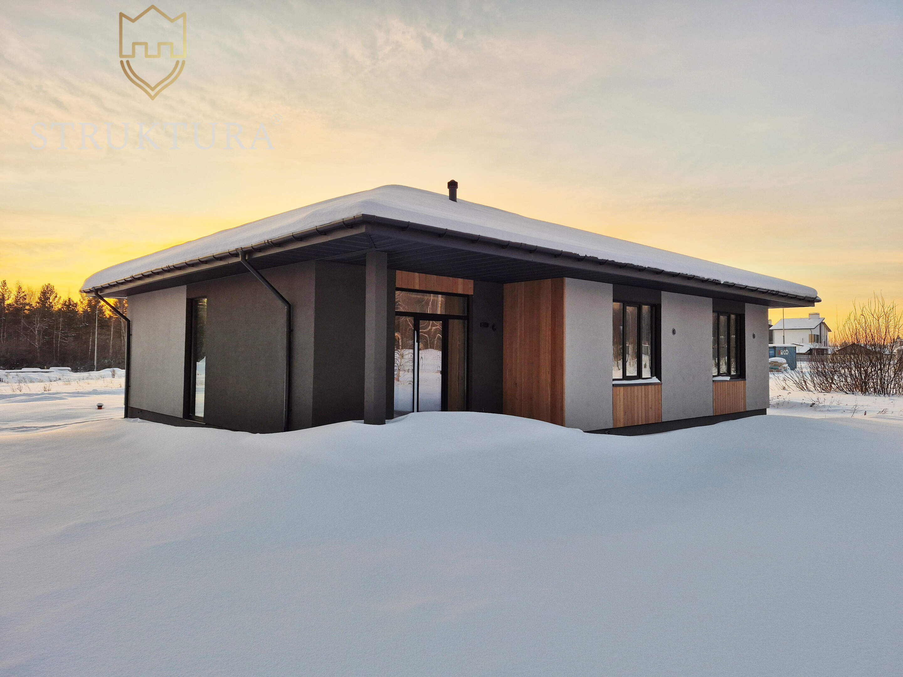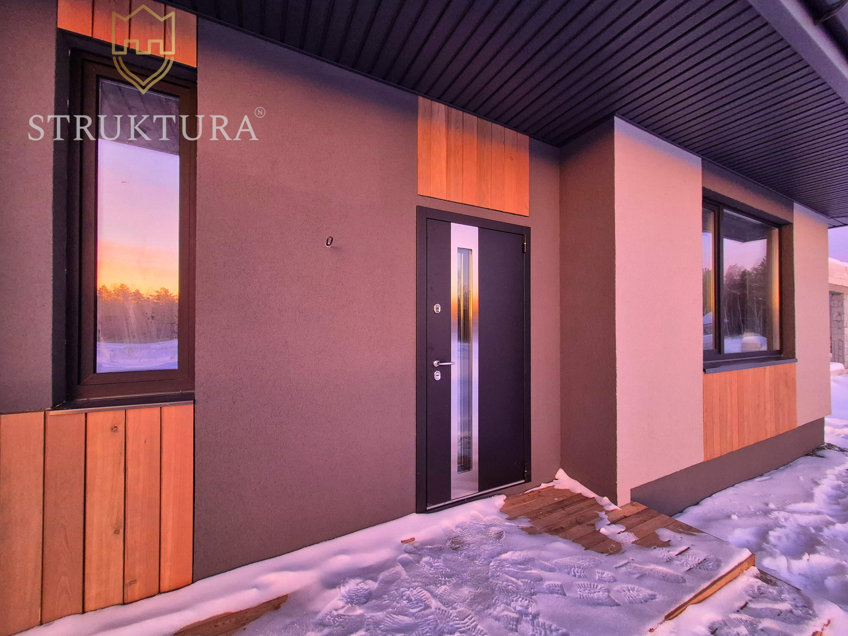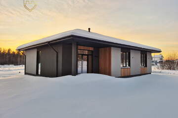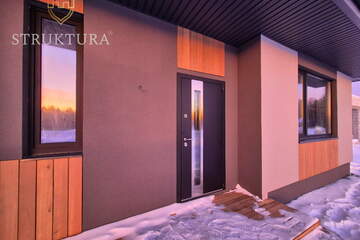 Дом построен из качественных материалов, на утеплённом монолитном бетонном фундаменте. Обустроена наружная водосточная система. Крыльцо располагается под общей крышей дома и оборудовано ступенями. Входная группа декорирована планкеном. Современный и практичный фасад отделан фактурной штукатуркой «Короед» серого цвета со вставками из древесного планкена в сочетании с оконными рамами чёрного цвета. Крыша дома покрыта кровлей из металлочерепицы и оборудована снегозадержателями — всё это вместе придает дому стильный и современный внешний вид. Оборудована система приточной-вытяжной вентиляции. Установлены энергосберегающие стеклопакеты с нанонапылением оксидов серебра – в летнее время они отражают избыточный ультрафиолет, что позволяет помещениям не нагреваться изнутри и сохранять комфортную температуру, а в холодный период препятствуют выходу тепла от отопительных приборов. Установлены морозостойкие входные двери.