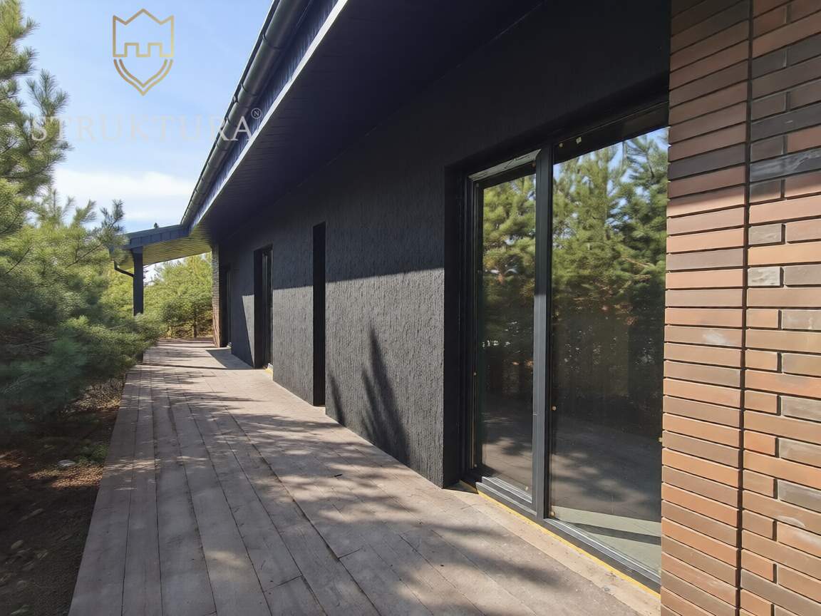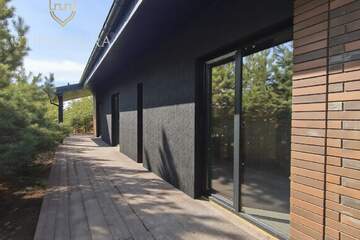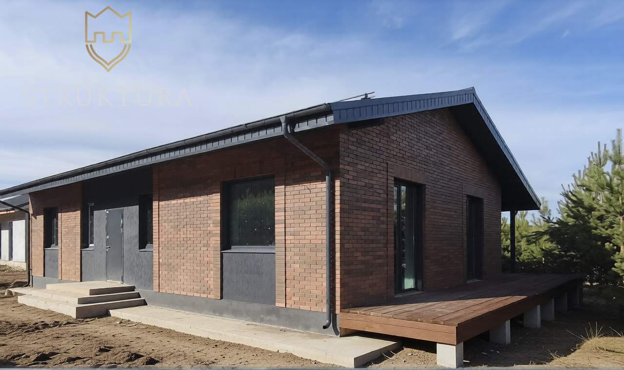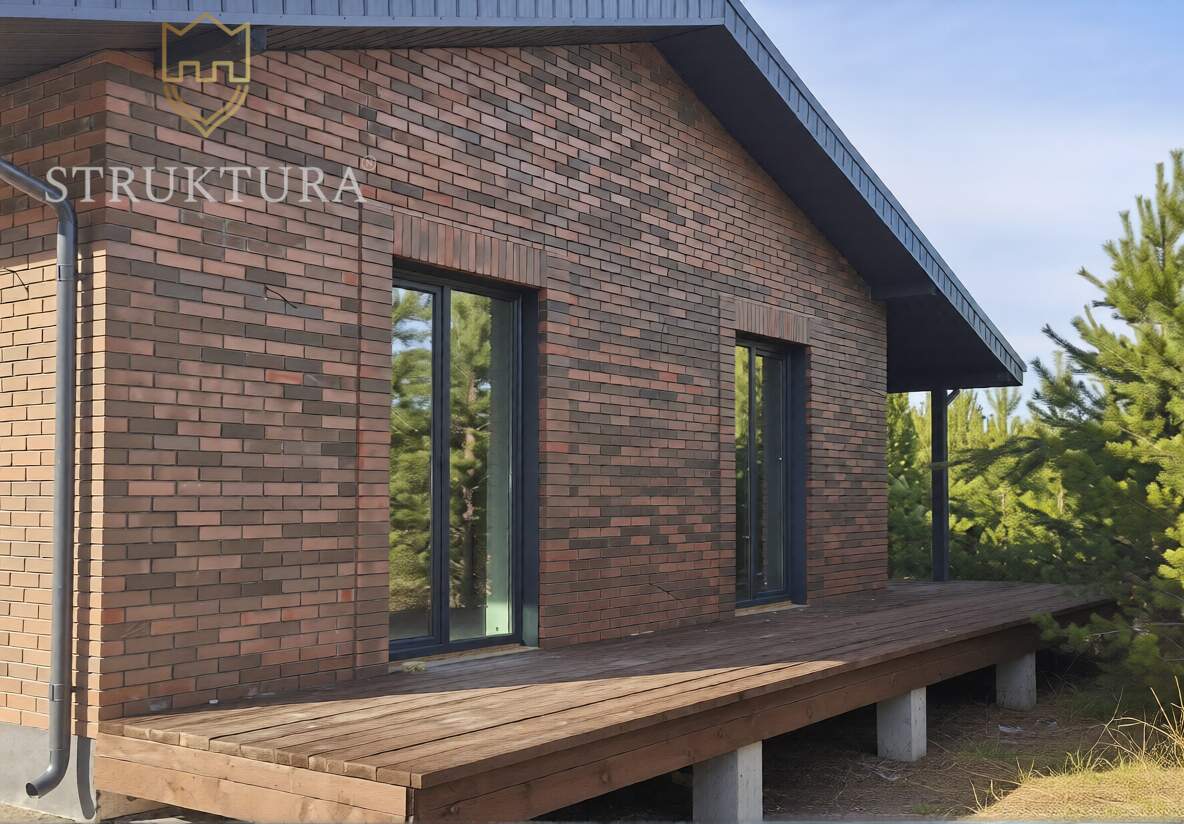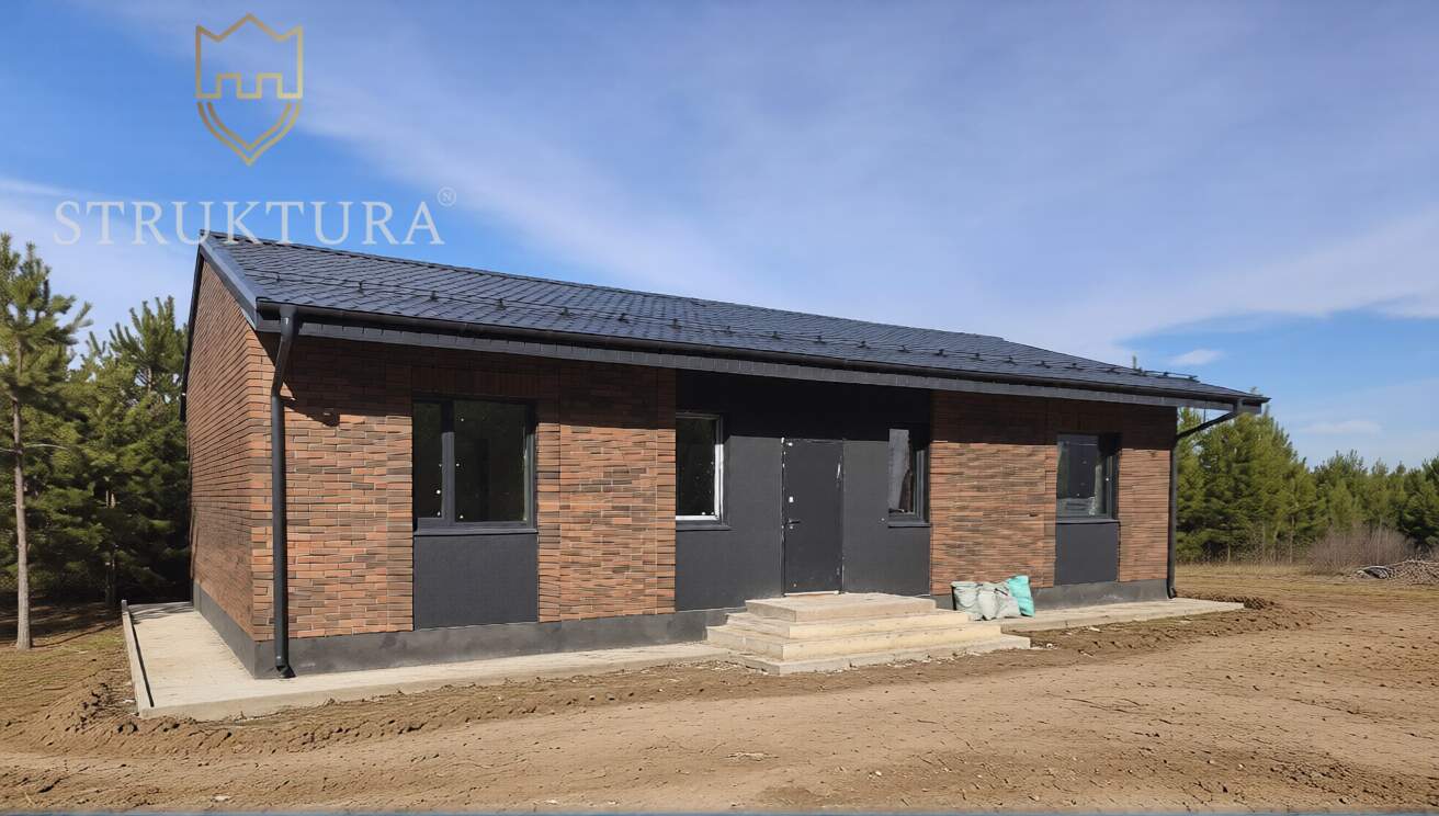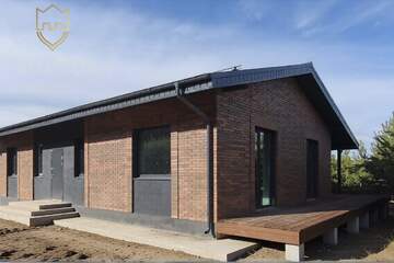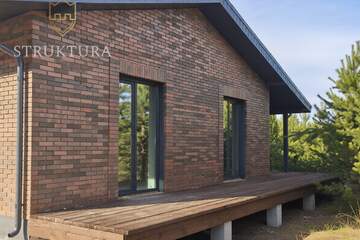 Дом привлекает внимание с первого взгляда: одноэтажное строение с эффектной облицовкой кирпичом выглядит солидно и стильно. Двускатная кровля из металлочерепицы оснащена снегозадержателями и водосточной системой — практично и надёжно в любое время года. Панорамные окна наполняют пространство светом и открывают восхитительные виды на лес и реку.