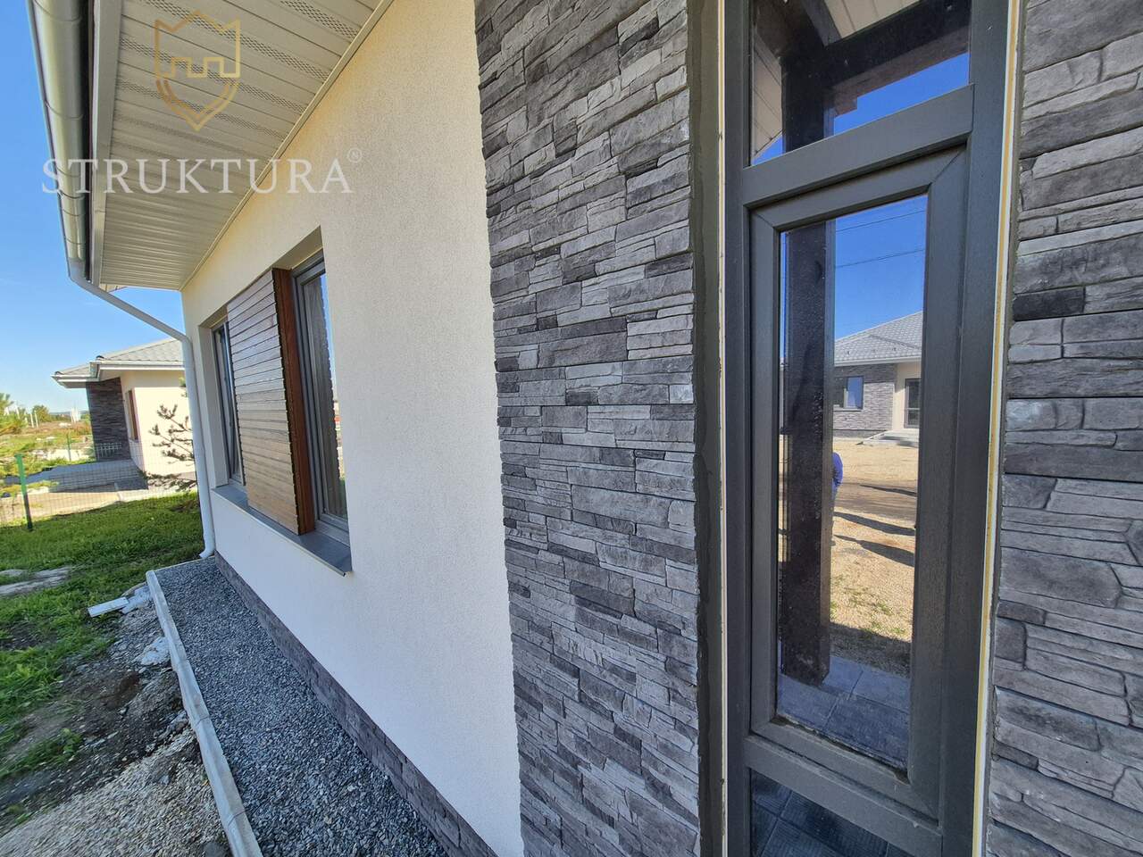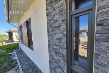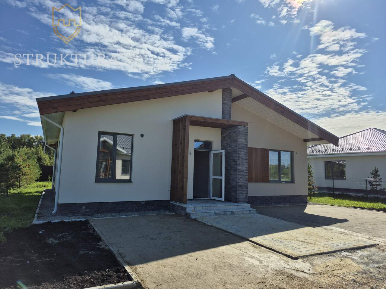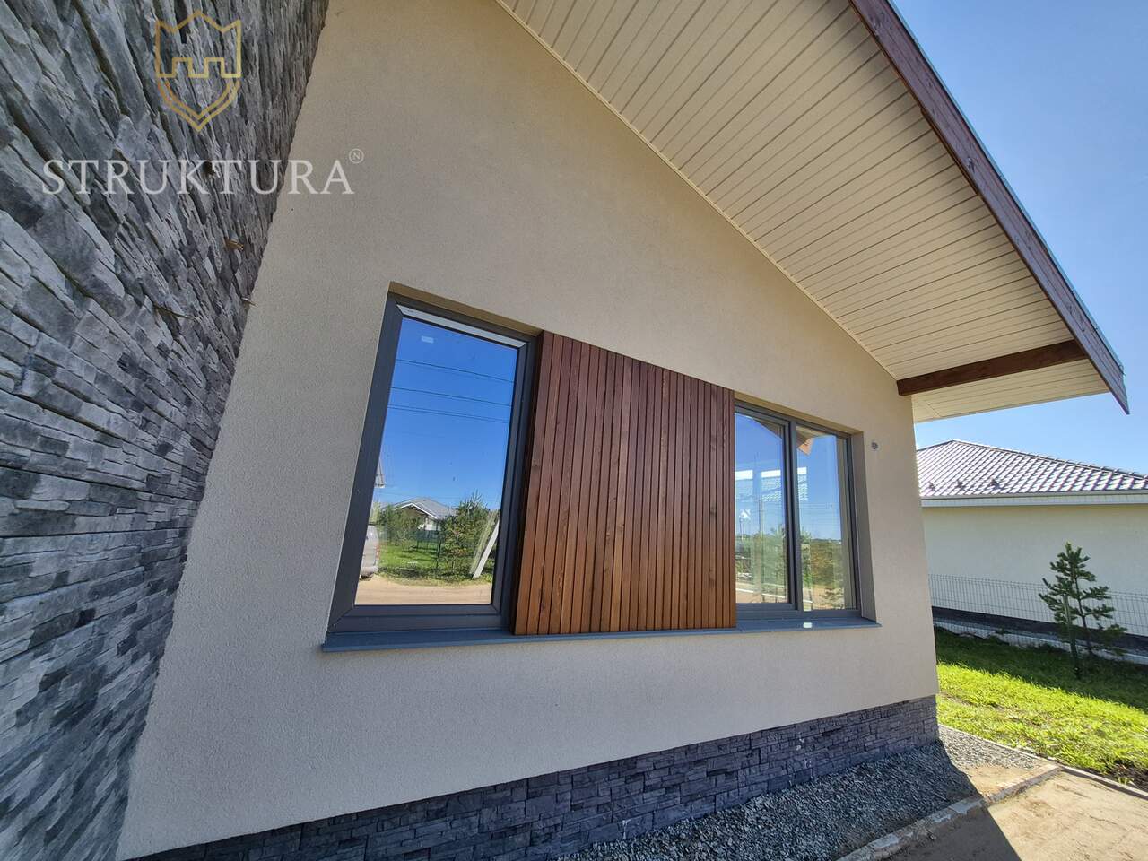 Дом построен из качественных материалов. Фундамент по периметру дома оборудован отмосткой, обустроена наружная водосточная система. Современный и практичный фасад отделан полимерной силиконовой штукатуркой бежевого цвета в сочетании со вставками из декоративного камня светло - серого цвета и дизайнерскими элементами, выполненными вагонкой из лиственницы в уровень с оконными проёмами. Ступени крыльца отделаны плиткой, а само крыльцо выполнено в виде входной группы с одной стороны из бруса, а с другой из монолитной стены, отделанной декоративным камнем. Над крыльцом сделана прозрачная крыша. Оконные проемы оборудованы стеклопакетом с зеркальным покрытием и саморегулируемой степенью прозрачности, что позволяет снизить до минимума нагрев в помещении от попадания прямых солнечных лучей в жаркую погоду. Крыша дома выполнена из металлочерепицы серого цвета — все это вместе придает дому стильный и креативный внешний вид. Терраса находится под единой крышей здания, она оборудована ступенями для удобства спуска и подъема.
