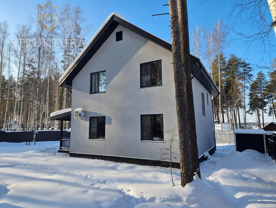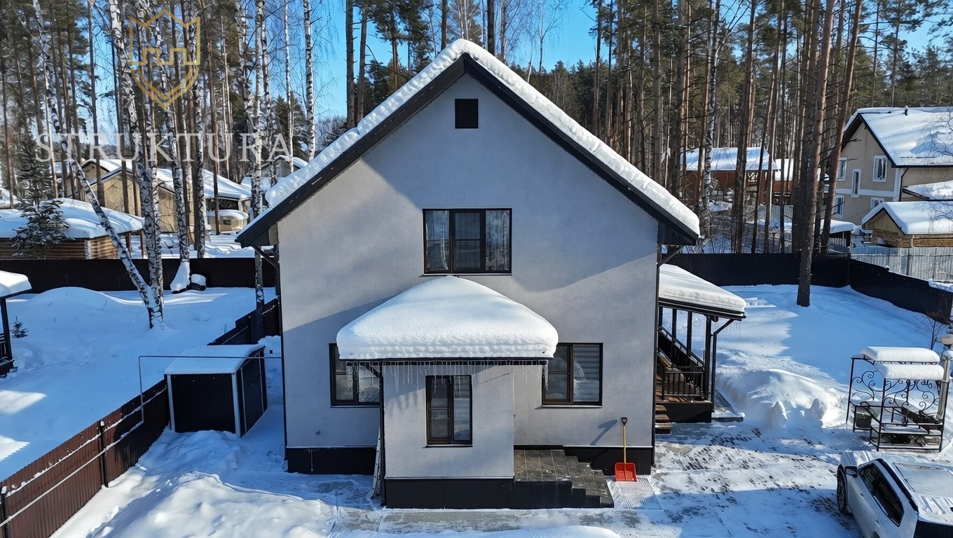 Дом — двухэтажный, с фасадом из камешковой штукатурки в благородных бело-графитовых тонах. Двускатная крыша из металлочерепицы, установлены снегозадержатели и водосточная система. По карнизам — тёплая гирлянда-подсветка, которая зимними вечерами напоминает сказку. Окна — ПВХ, графитового цвета, отлично вписываются в архитектуру. Входная группа выделена тамбуром. Терраса под крышей, выложенная палубной доской — идеальное место для утреннего кофе или вечерних посиделок.
