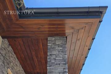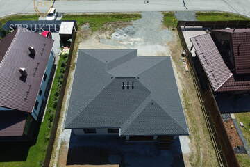 Этот дом сочетает в себе комфорт, качество и современные технические решения — идеальный вариант для тех, кто ценит премиальный загородный стиль жизни. Элегантный фасад выполнен камешковой штукатуркой теплого серого цвета, а цоколь, ступени и входная зона украшены декоративным камнем. Кровля, вальмового типа, покрыта мягкой черепицей, установлена водосточная система и снегозадержатели для надежной эксплуатации в период осадков. Террасы выполнены из бетона и обшиты натуральной палубной доской. Премиальные окна профиля Gealan с 6 камерами, наружной ламинацией и мультифункциональными стеклопакетами гарантируют отличную тепло- и звукоизоляцию. Современная цветовая гамма включает различные оттенки серого, гармонично сочетающиеся с отделкой из камня и дерева.