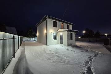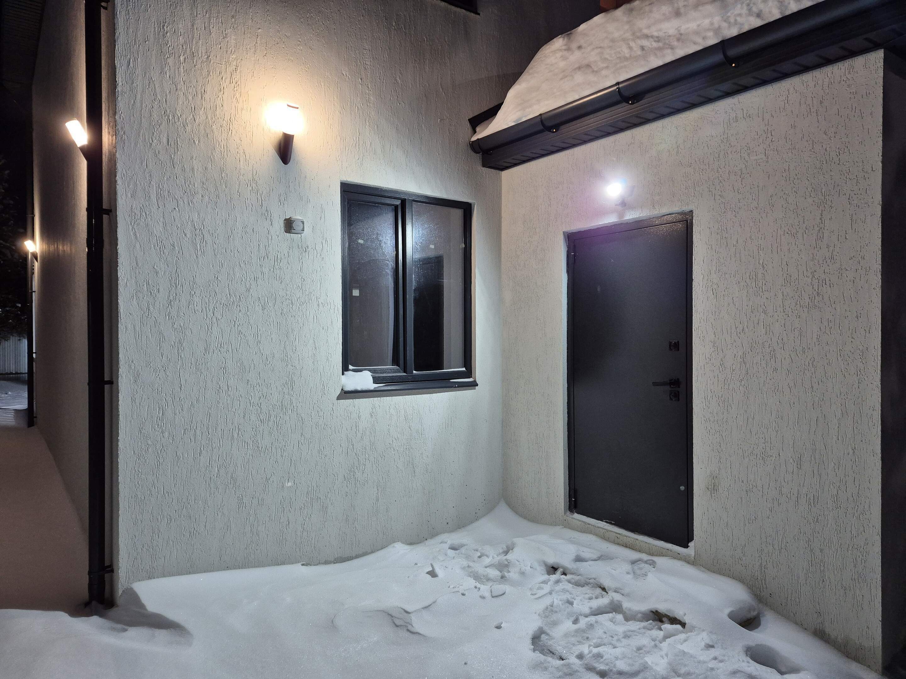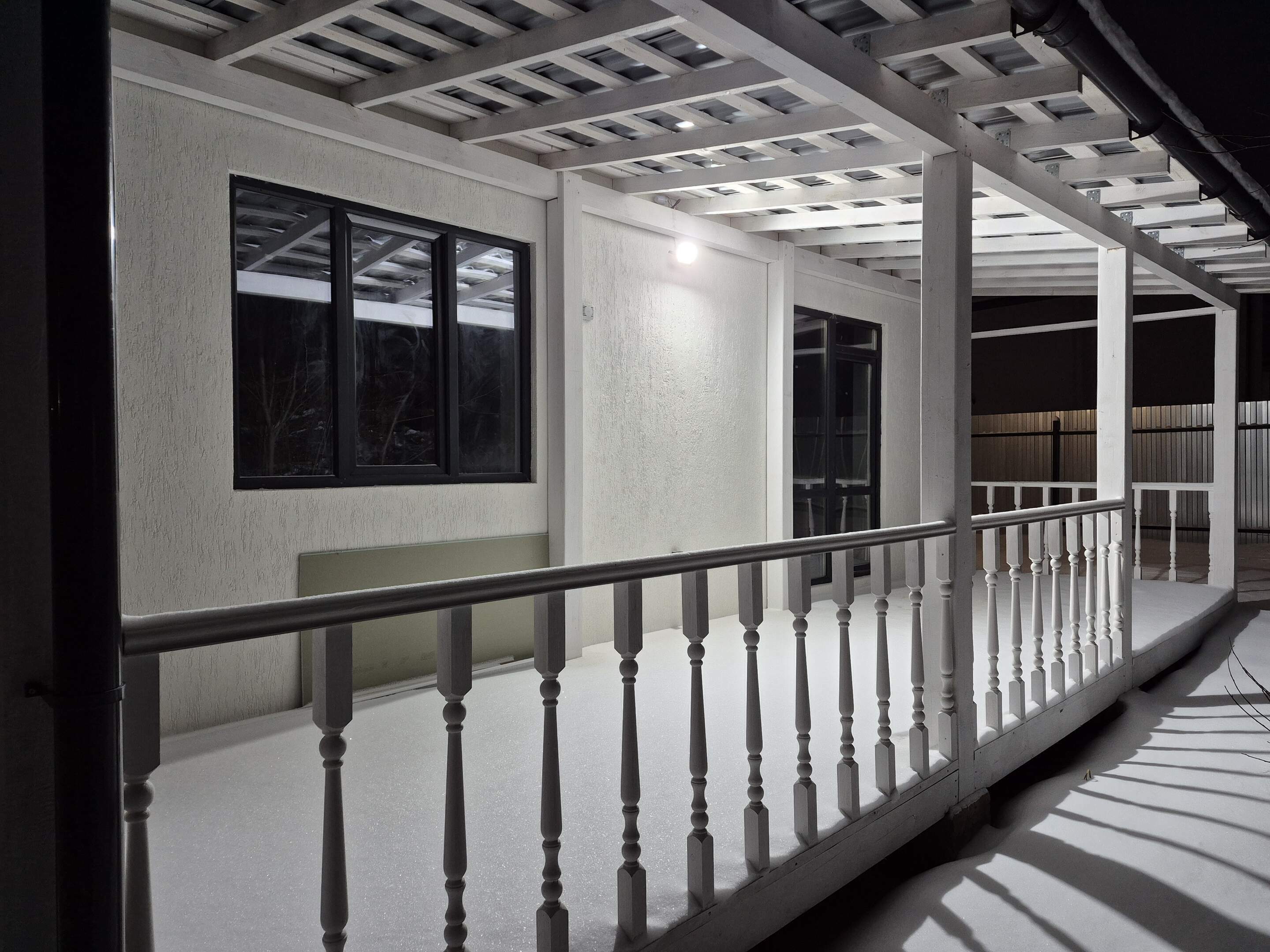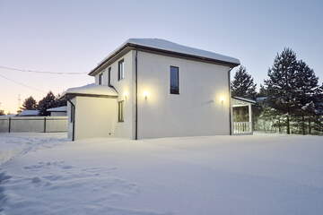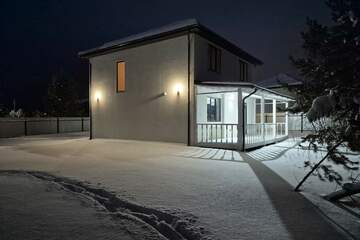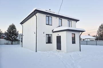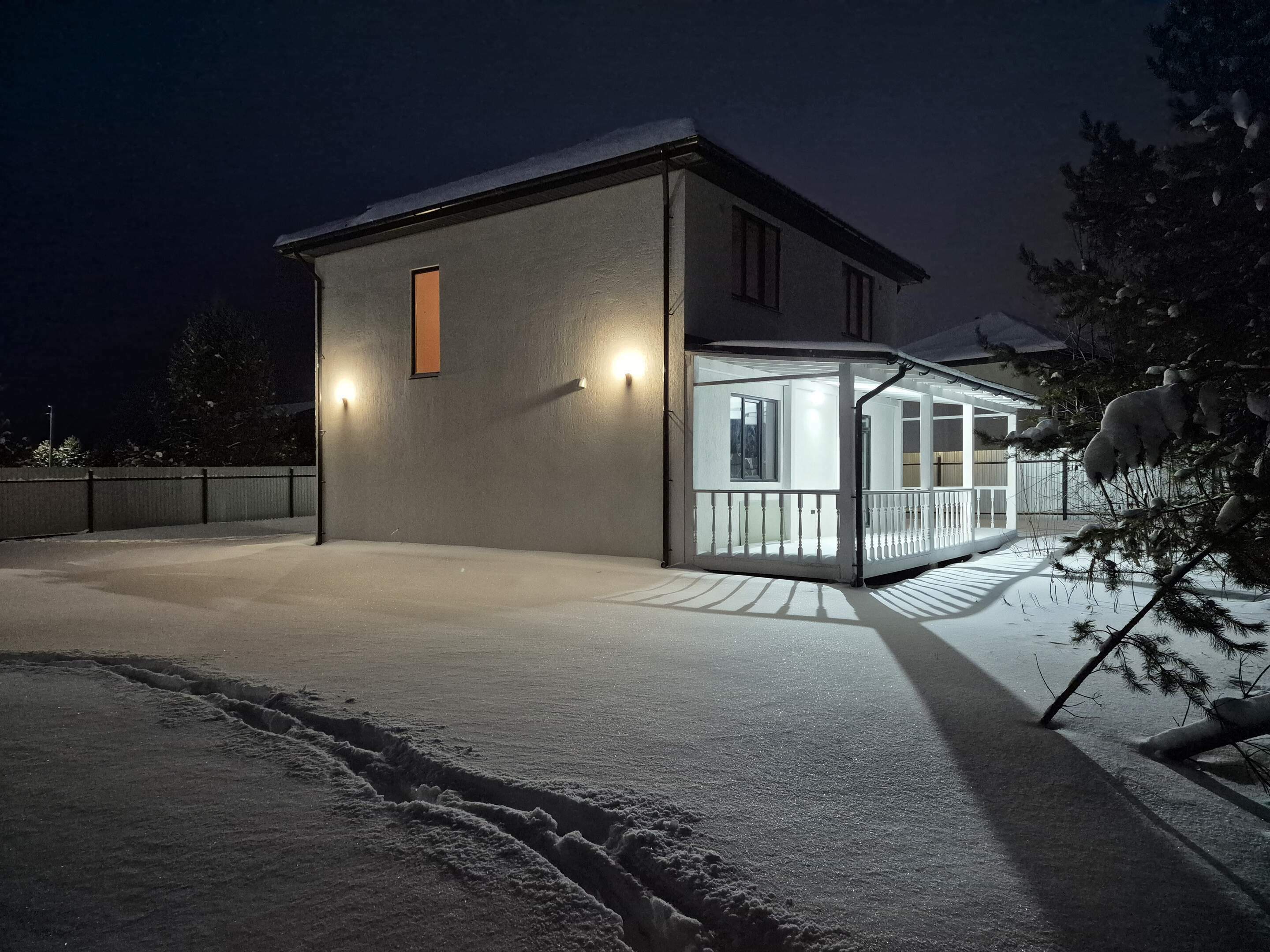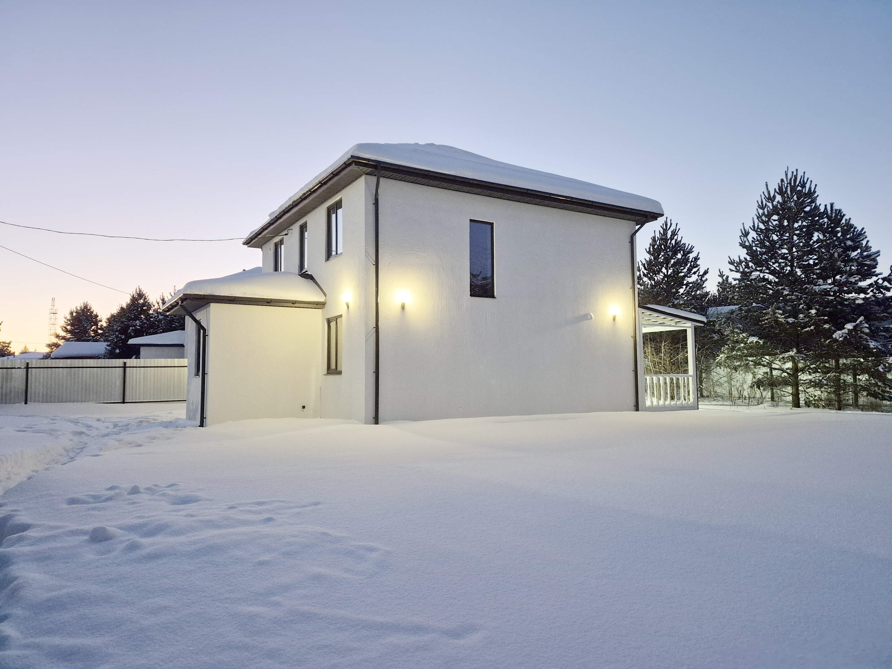 Дом построен из качественных материалов, на монолитном фундаменте, защищенном отмосткой по периметру дома, которая отсыпана мелким камнем светлого цвета – положено начало ландшафтному дизайну. Обустроена наружная водосточная система. Современный и практичный фасад отделан фактурной штукатуркой «Ручеек», бежевого цвета в сочетании с оконными рамами темного цвета. Крыша дома покрыта металлочерепицей серого цвета и оборудована снегозадержателями — все это вместе придает дому стильный и современный внешний вид.