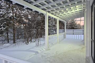 Терраса располагается под отдельной крышей и выполнена в классическом стиле. Навес над ней сделан из толстого бруса, а ограждение выполнено резными элементами из дерева.