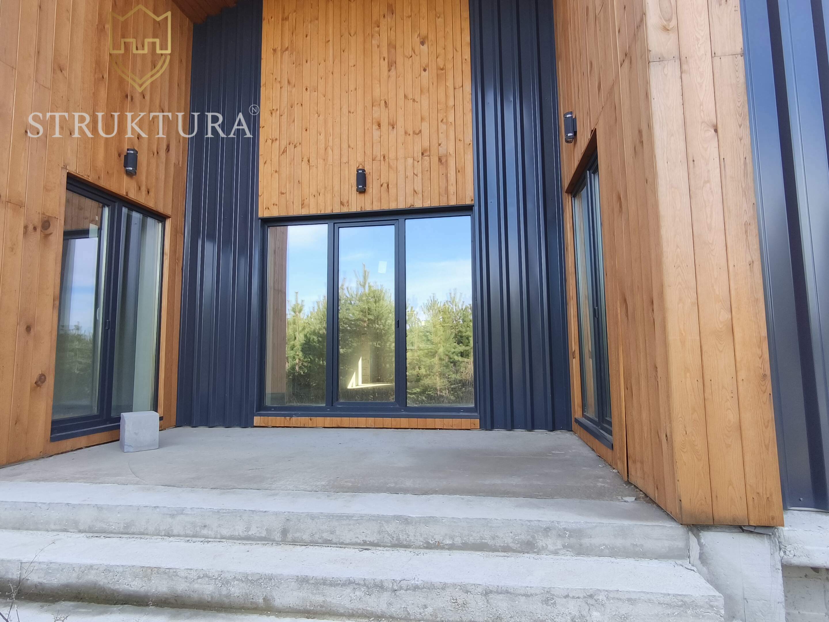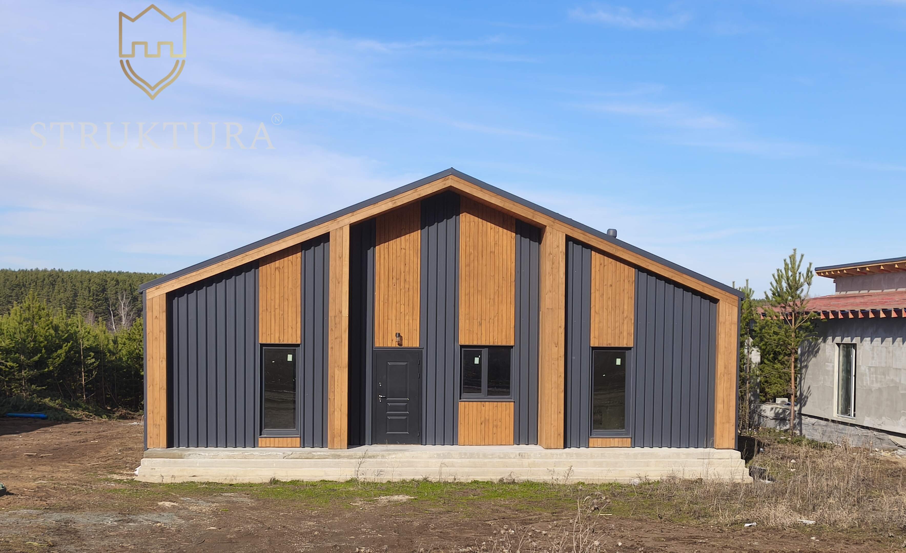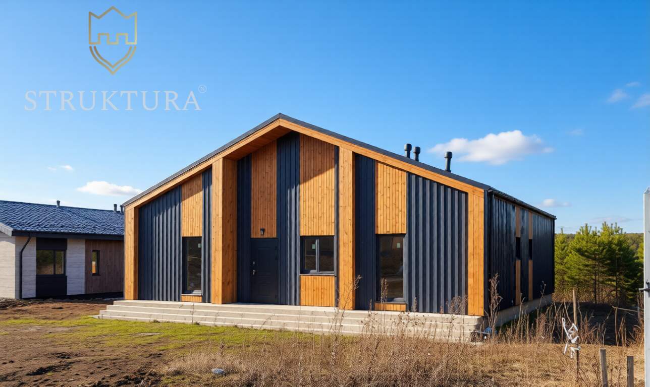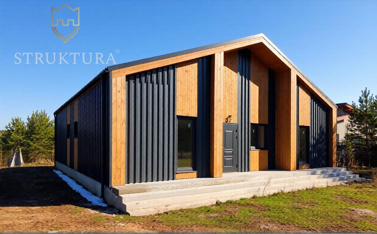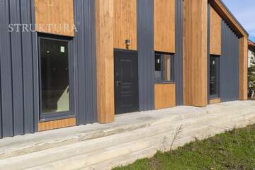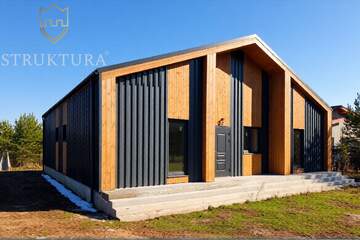 Дом сразу приковывает взгляд: эффектный одноэтажный барн с продуманным внешним обликом. Фасад облицован планкеном и дополнен подсветкой по периметру — вечером дом выглядит по‑настоящему волшебно. Двускатная кровля из металлочерепицы оснащена водосточной системой, а панорамные окна с чёрными рамами и мультифункциональными стеклопакетами обеспечивают отличную тепло- и шумоизоляцию. Входная группа и терраса укрыты крышей — можно наслаждаться отдыхом на свежем воздухе в любую погоду.