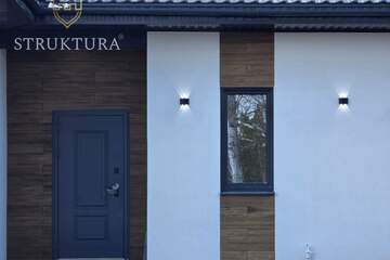 Фасад дома выполнен в сочетании штукатурки и плитки с текстурой дерева. Входное крыльцо дома утоплено внутрь и убережет вас от осадков в ненастную погоду. Надежная крыша вальмового типа имеет установленную систему снегозадержателей и водосточную систему.