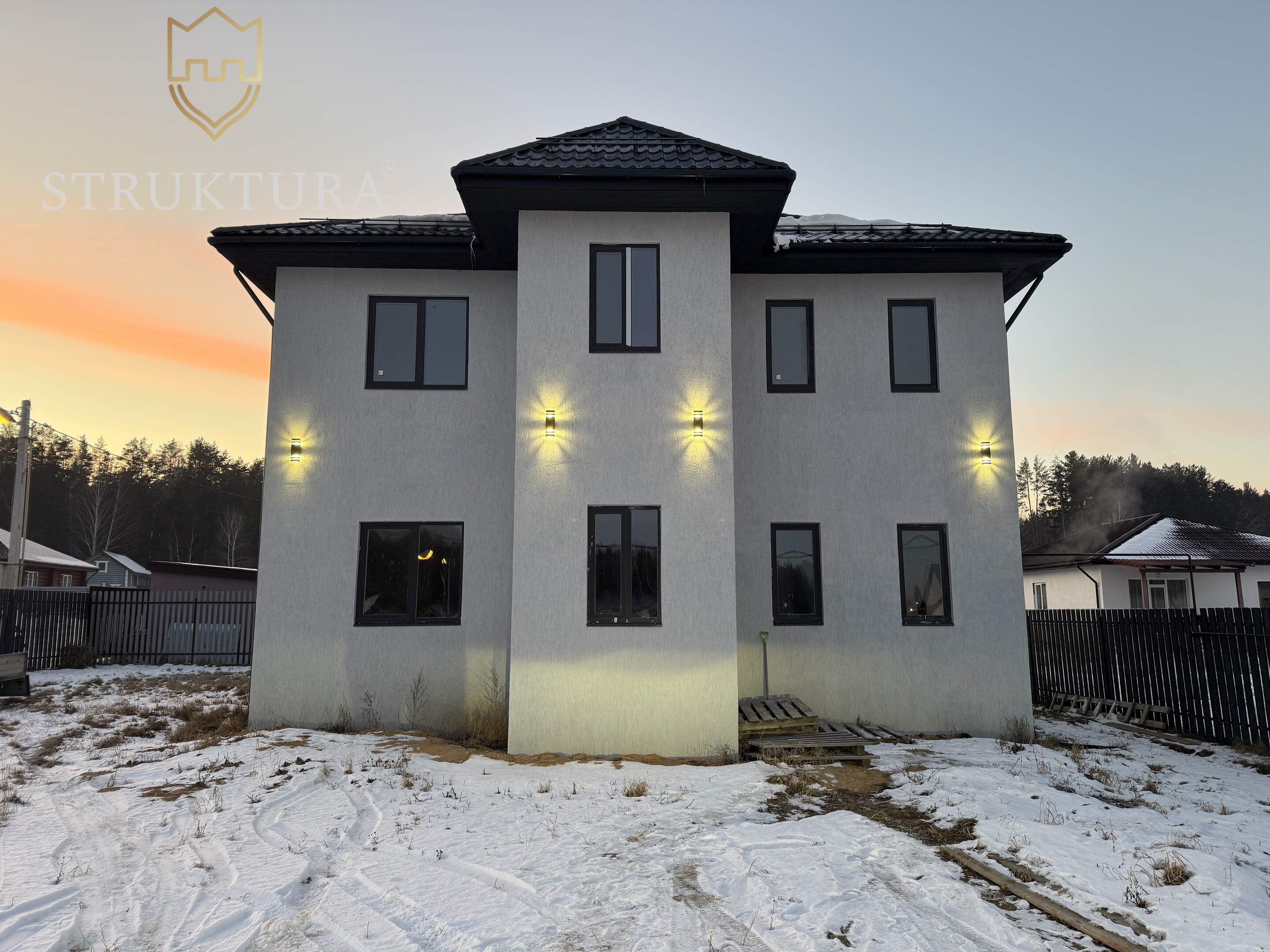 Фасад дома выполнен в светлой штукатурке, а по периметру выведено освещение, которое придаёт дому особую атмосферу в вечернее время. Посмотрите на крышу: снегозадержатели по всему периметру — это безопасно для вашей семьи, особенно в зимний период. А качественные окна надёжного бренда VEKA цвета графит гарантируют вам тепло и уют.