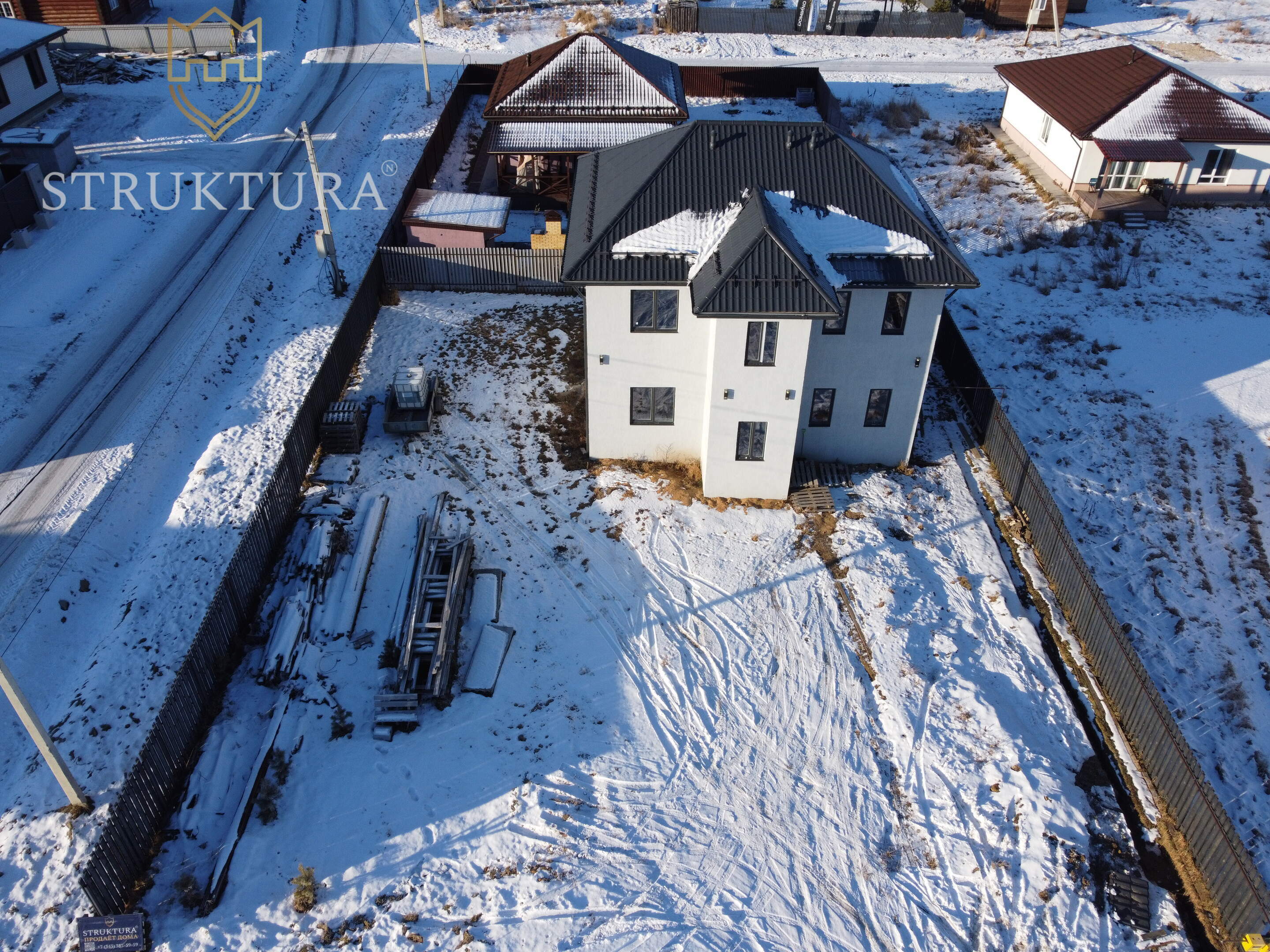 К дому ведёт хорошая асфальтовая дорога. Участок угловой, что создаёт ощущение простора, всего два соседа по близости. Забор обрамляет территорию с трёх сторон, с участка и из окон дома открываются прекрасные виды на живописный лесной массив.