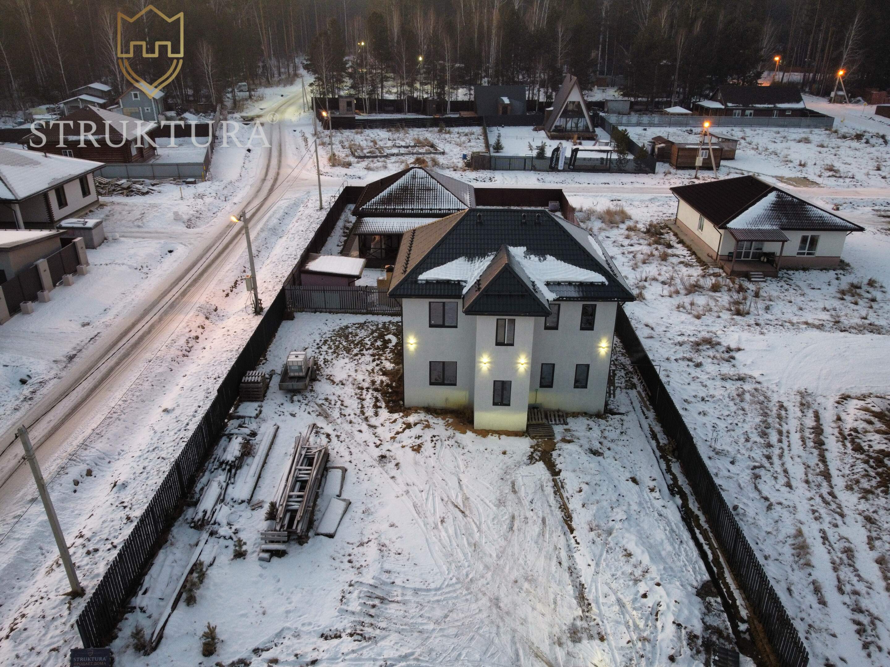 Фасад дома выполнен в светлой штукатурке, а по периметру выведено освещение, которое придаёт дому особую атмосферу в вечернее время. Посмотрите на крышу: снегозадержатели по всему периметру — это безопасно для вашей семьи, особенно в зимний период. А качественные окна надёжного бренда VEKA цвета графит гарантируют вам тепло и уют.
