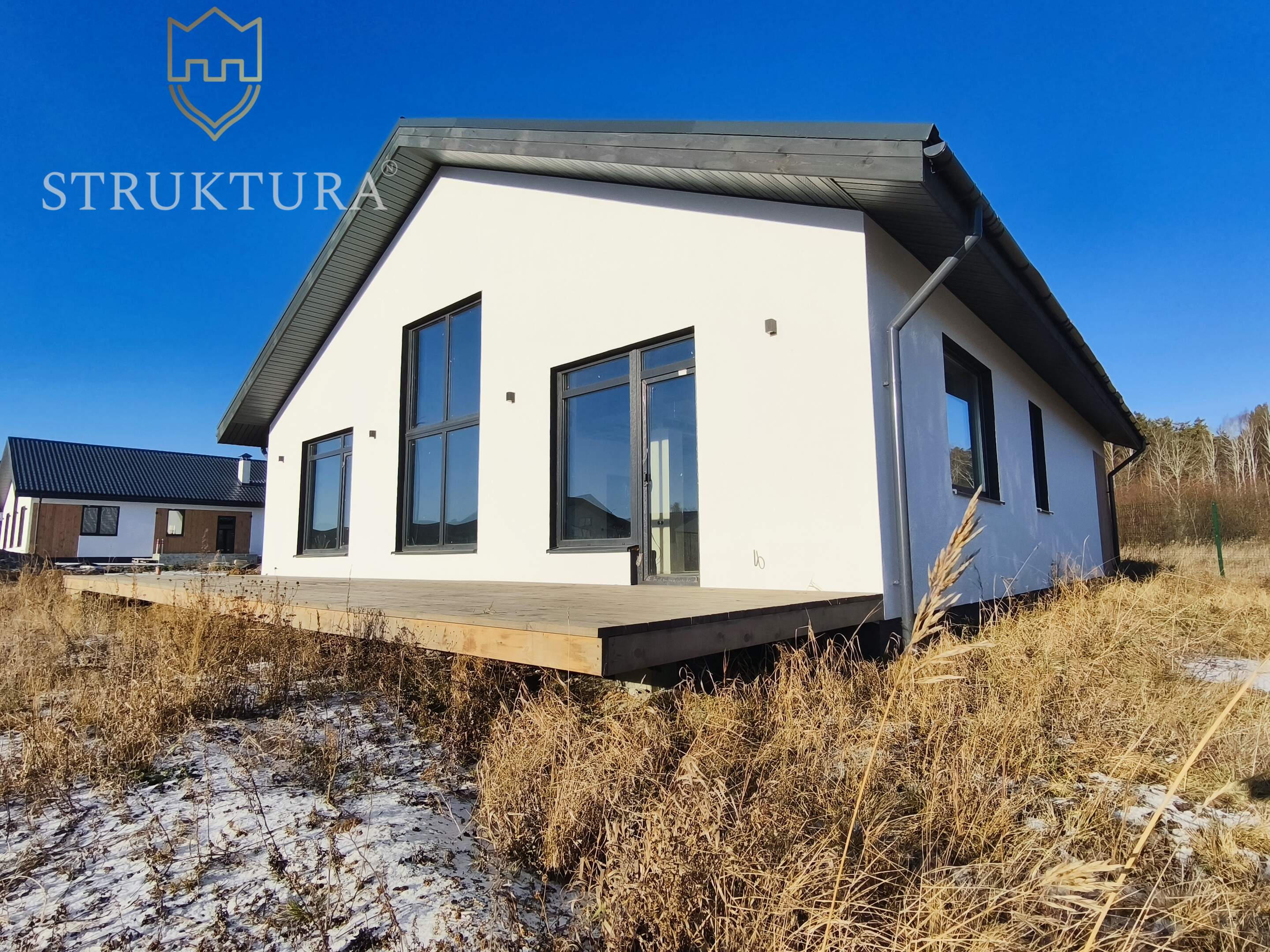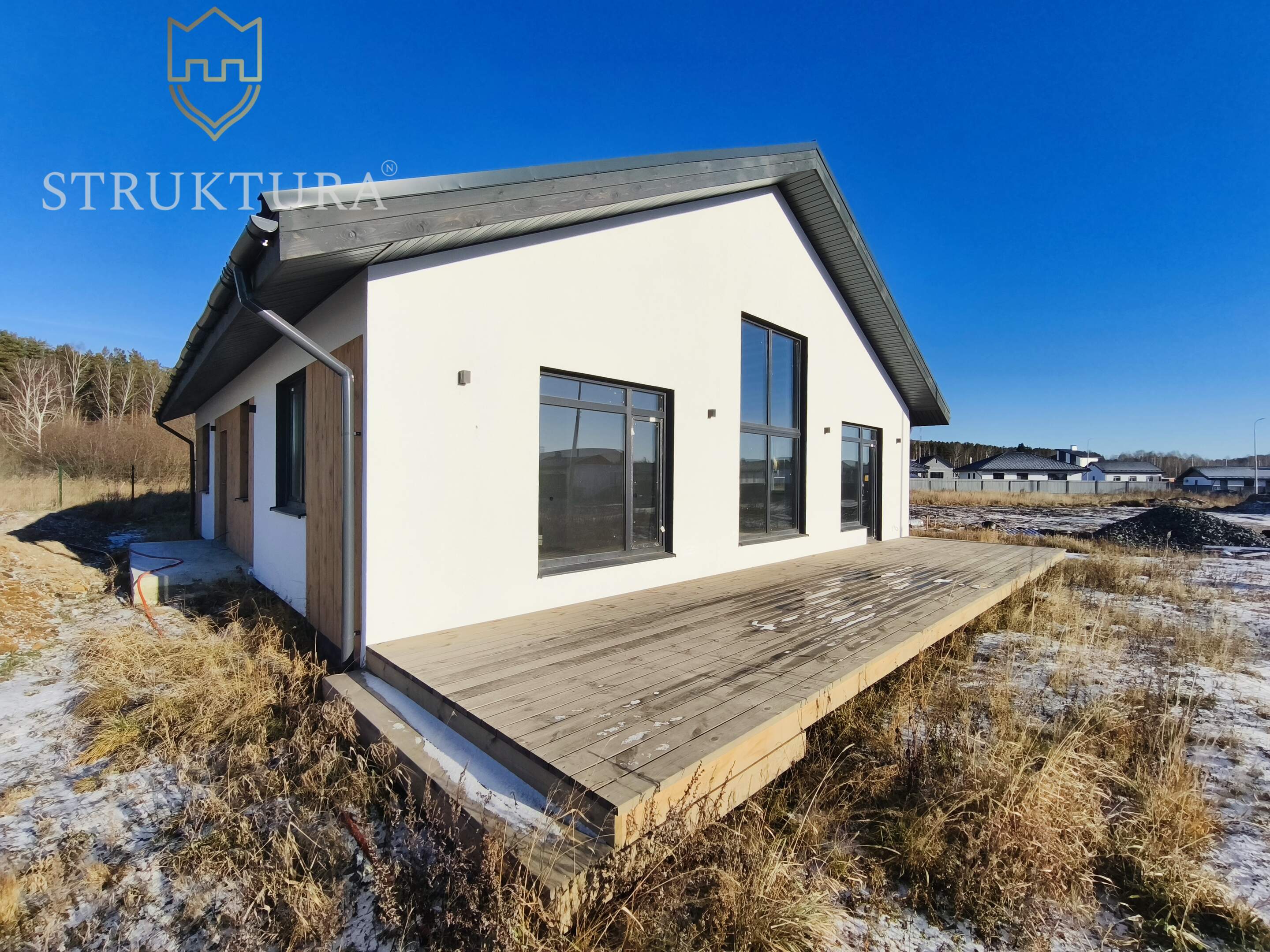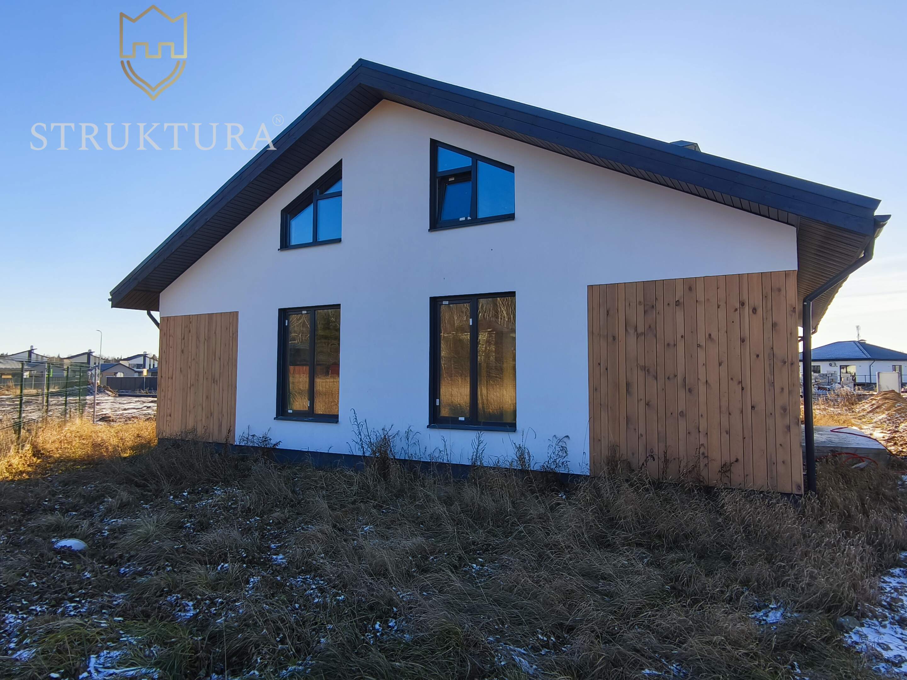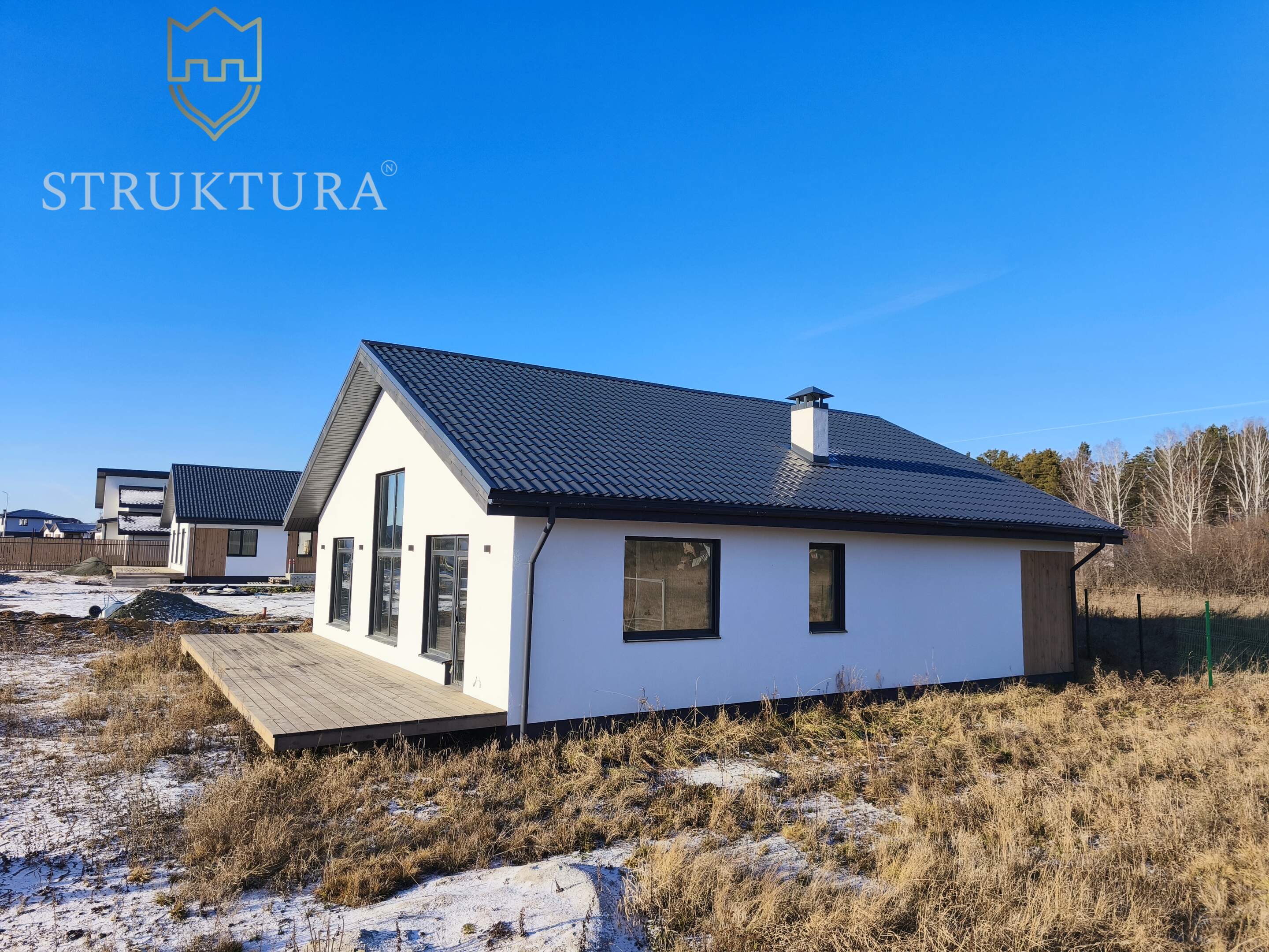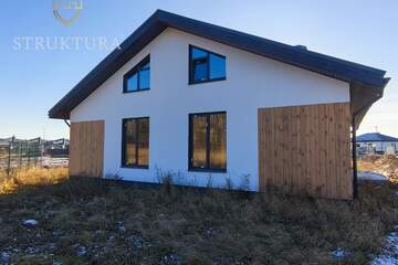 Дом построен с учётом всех особенностей местности — высокое расположение обеспечивает прекрасный вид и защиту от влаги. Фасад дома выполнен в элегантном стиле: белая декоративная штукатурка гармонично сочетается с изящными деревянными элементами. Двускатная крыша покрыта металлочерепицей, гарантирующая надёжную защиту от любых погодных условий.
