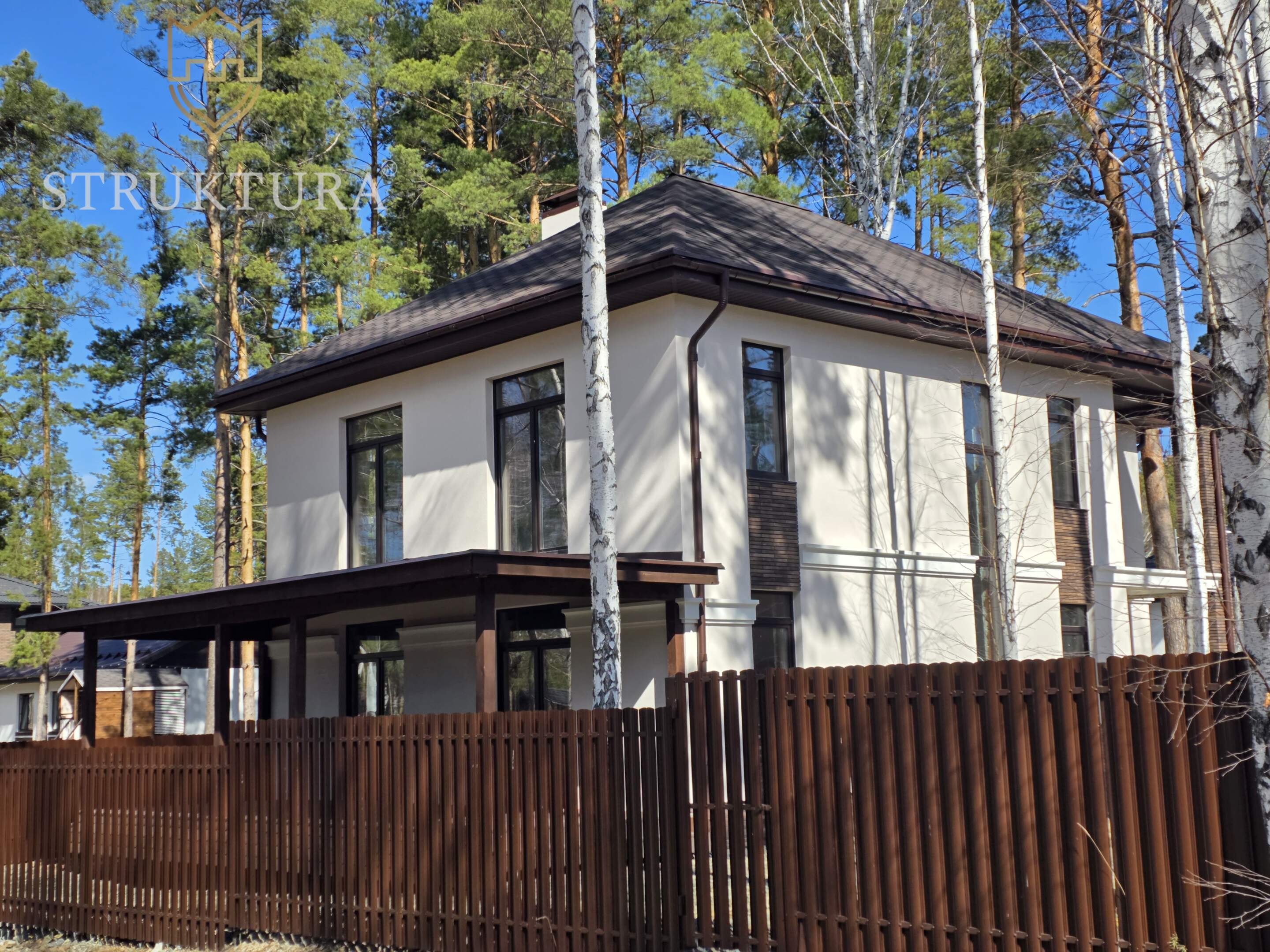Коричневый тон поддержан в других деталях: он повторяется в цвете водосточной системы и подшиве кровли.
