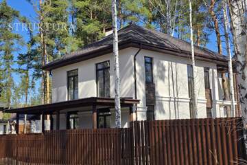 Фасад дома производит впечатление основательности и современного стиля. Основу конструкции составляет тёплый керамический блок — надёжное и энергоэффективное решение. Для дополнительной теплоизоляции фасад утеплён слоем минераловатного утеплителя толщиной 100 мм.