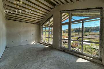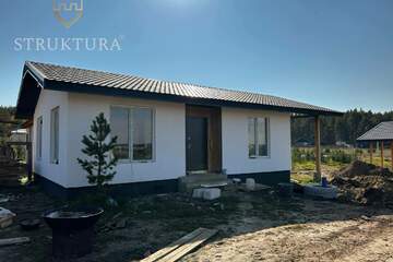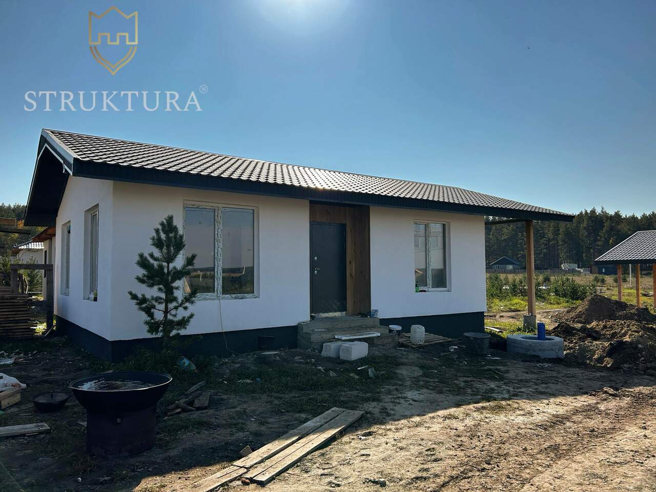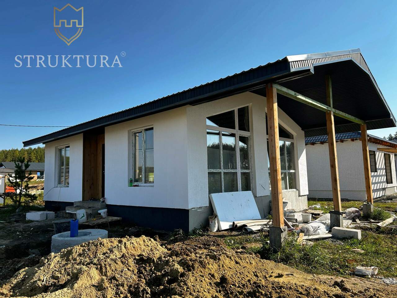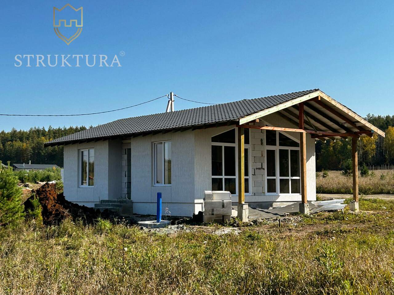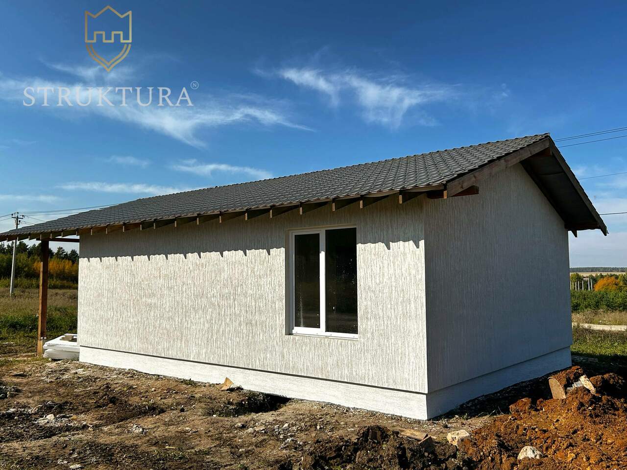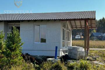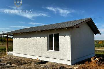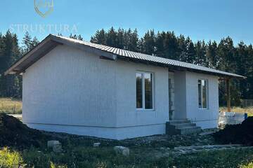 Внутри дома продуманная планировка: холл, две изолированные спальни. Центральное место занимает большая кухня-гостиная, объединённая с террасой. В доме один санузел.