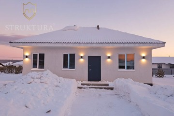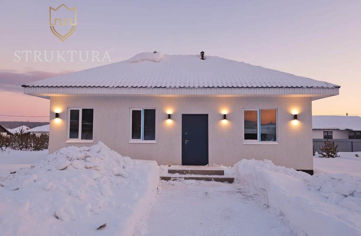 Дом встречает своим аккуратным и стильным обликом: фасад покрыт светлой штукатуркой «короед», которая придаёт поверхности интересную фактуру и мягко отражает солнечный свет. В вечернее время фасад преображается благодаря продуманной подсветке. Кровля четырёхскатная, надёжно укрытая металлочерепицей — её ровные, чёткие линии придают дому строгий и ухоженный вид.