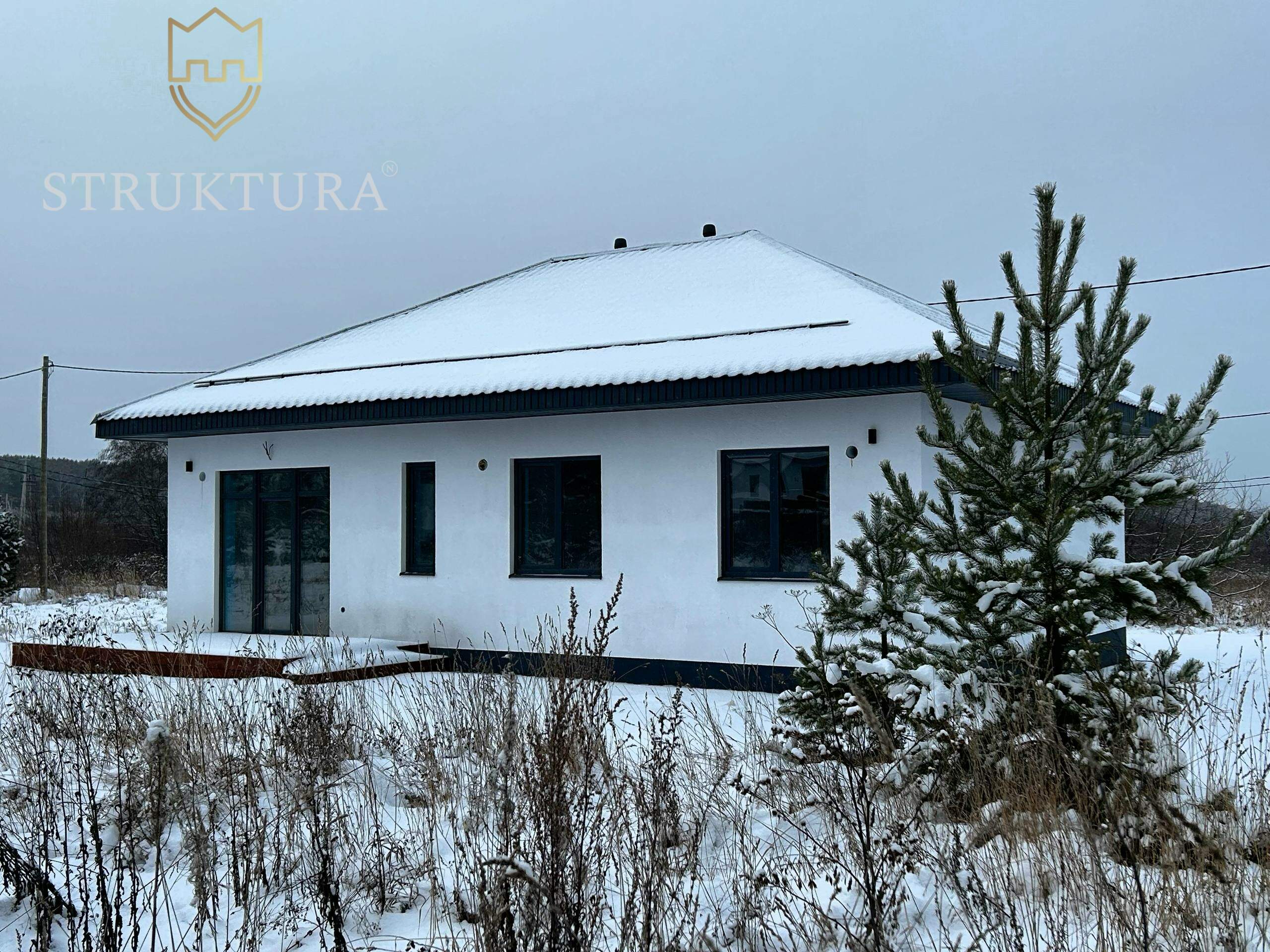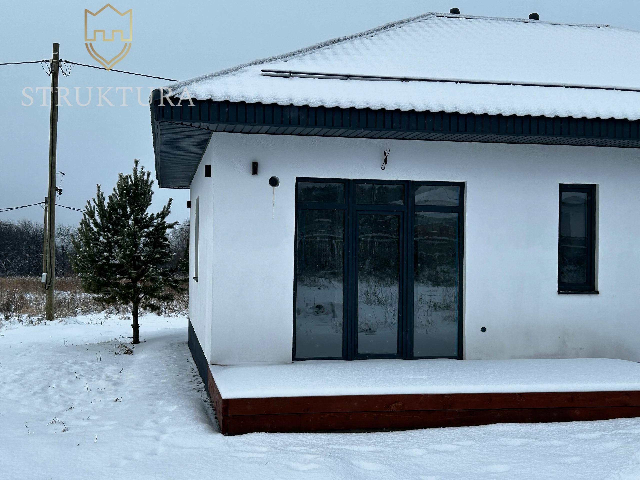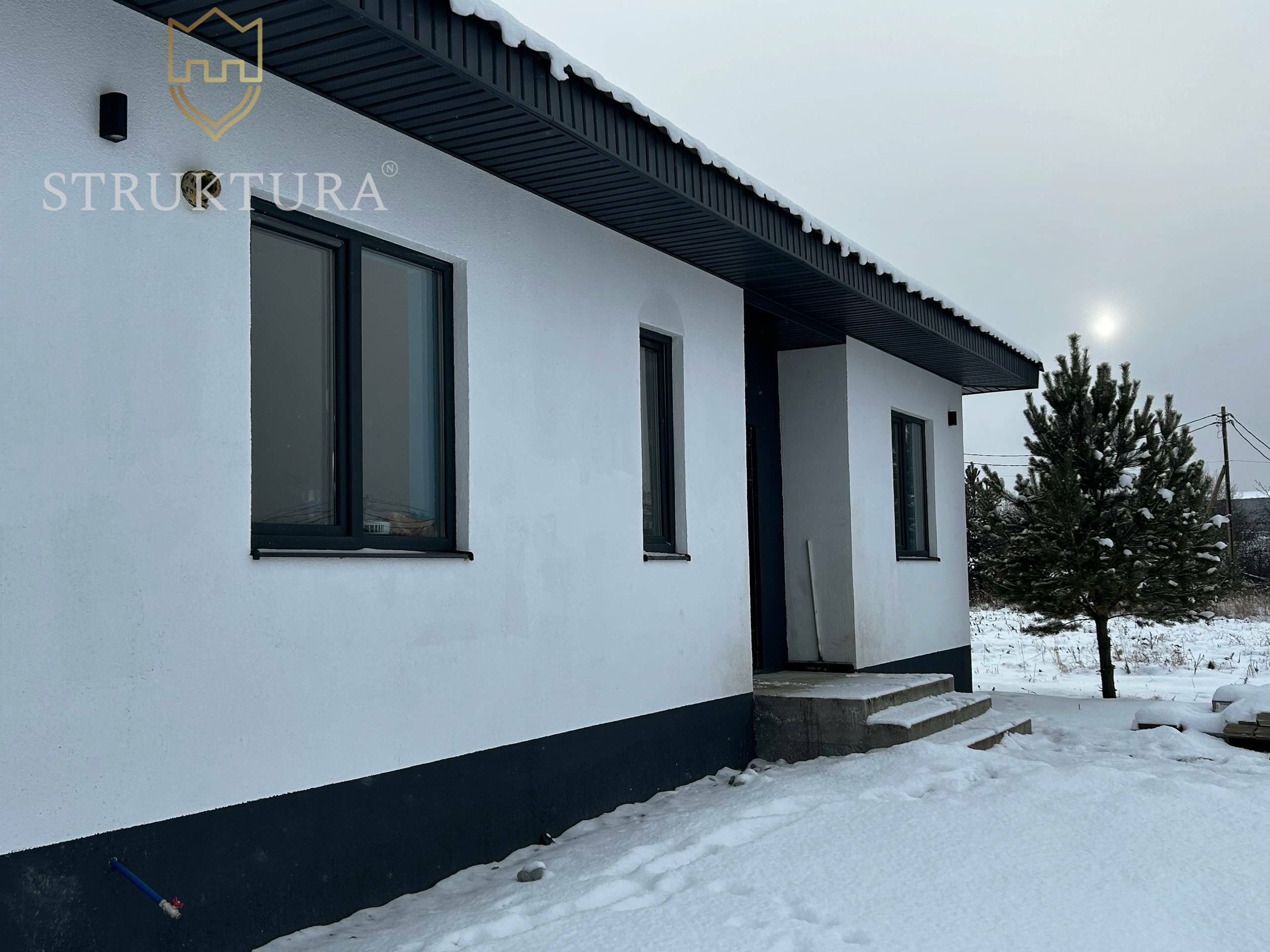 Фасад дома выполнен камешковой штукатуркой, контрастный акцент добавлен окнами в черном цвете, которые эффектно выделяются на светлом фоне, подчеркивая геометрию здания. Кровля покрыта надежной металлочерепицей, установлена система снегозадержателей. Дом выглядит современно, но при этом вписывается в природу, как будто всегда был частью этого места.