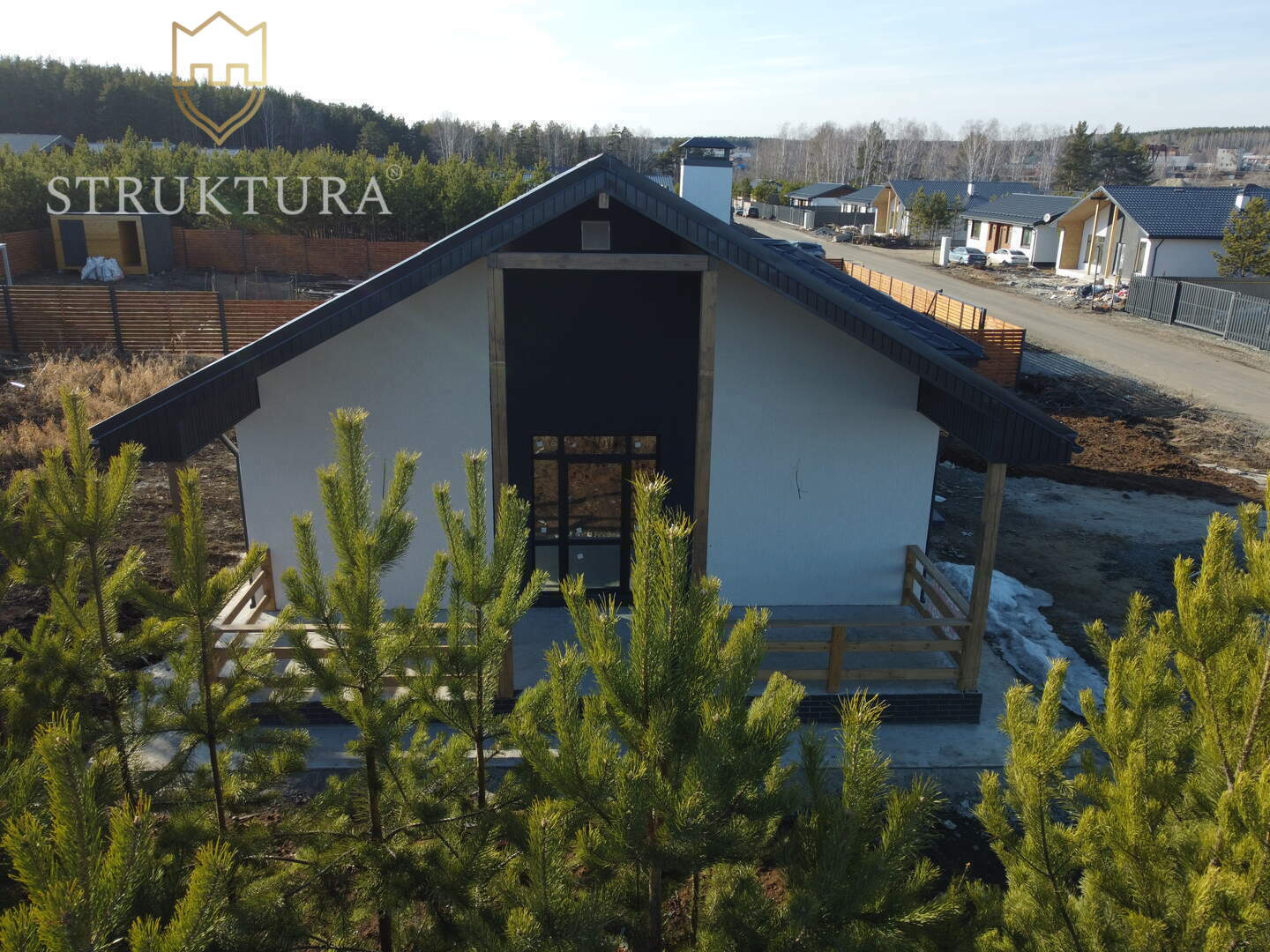 Фасад дома выполнен в сочетании штукатурки и натурального дерева. Входное крыльцо дома находится под крышей, что убережет вас от осадков в ненастную погоду. Надежная крыша двускатного типа покрыта металлочерепицей графитового цвета комплектом к окнам того же оттенка .