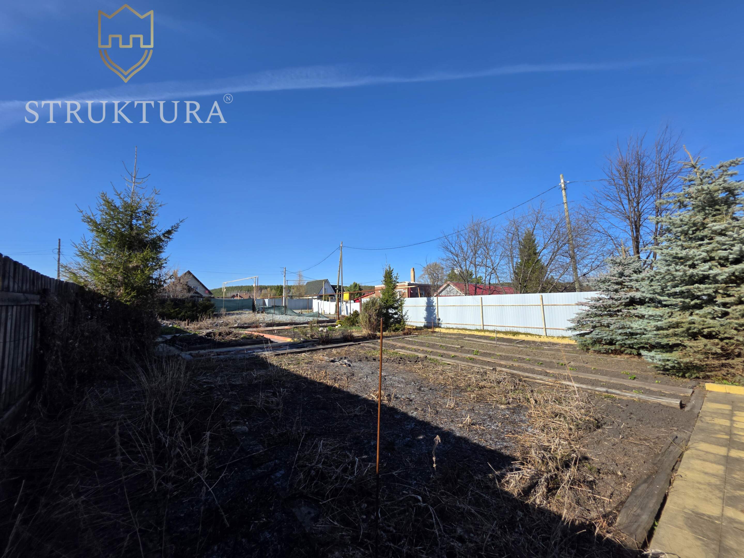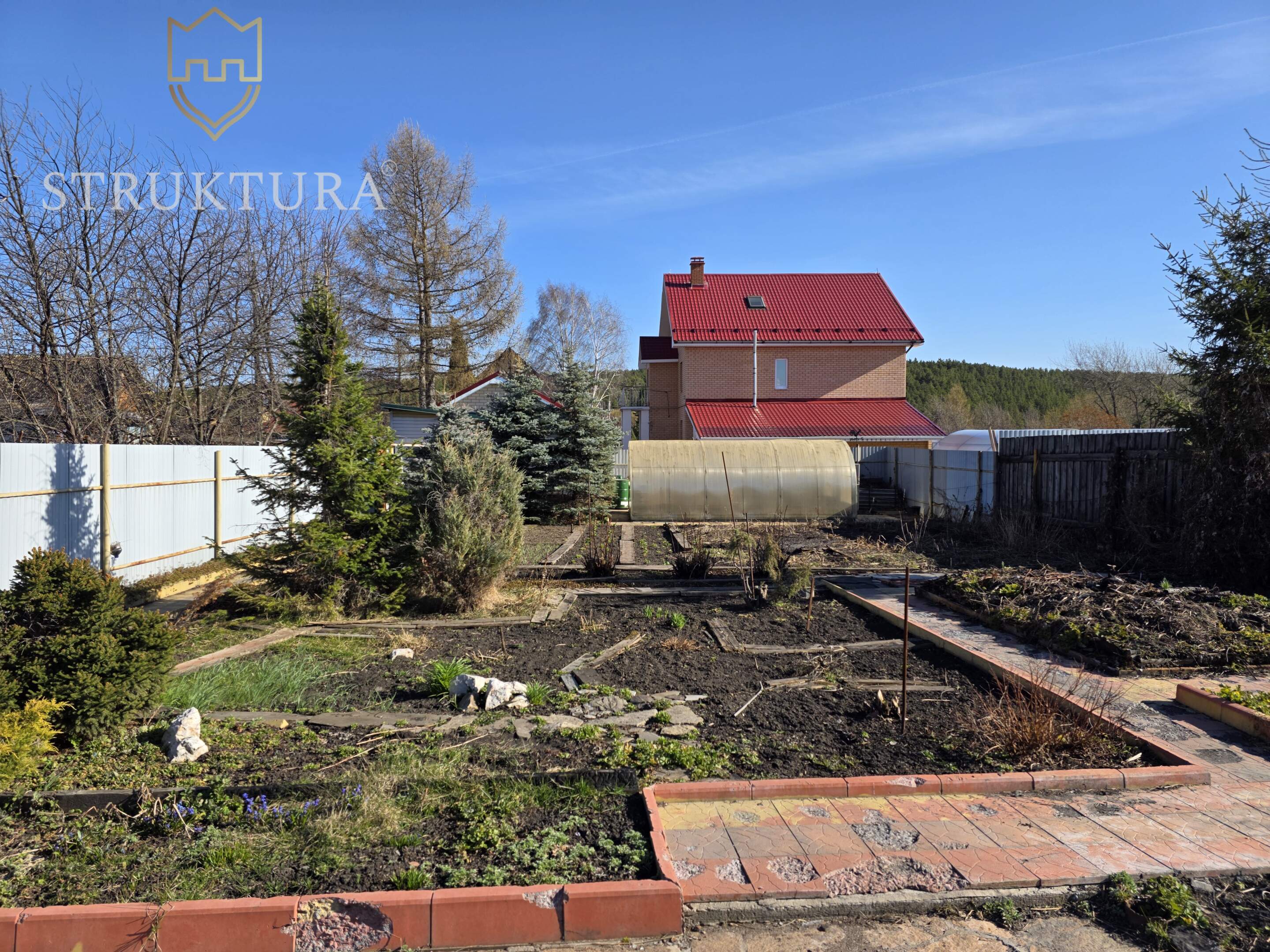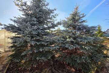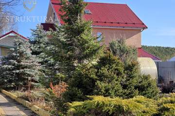 Участок с асфальтированным подъездом, угловой, рядом всего два соседа с просторными участками, дома стоят на большом расстоянии друг от друга. Территория частично огорожена (три стороны), благоустроена: тропинки ведут к грядкам и теплице, а голубые и обычные ели вместе с можжевельниками создают особый колорит. Подключено электричество, газ — у границы участка.