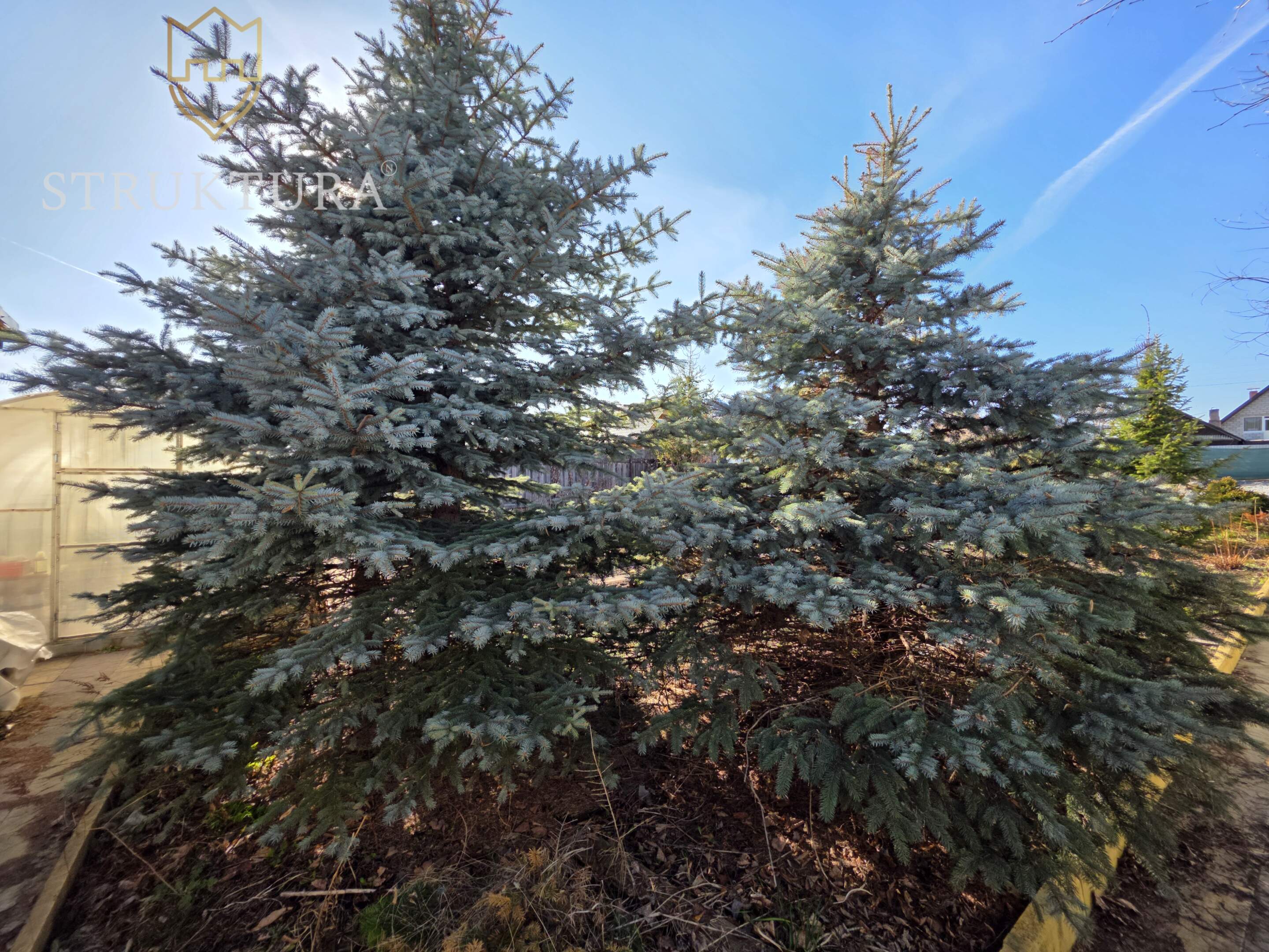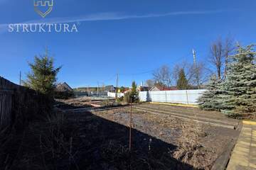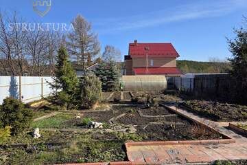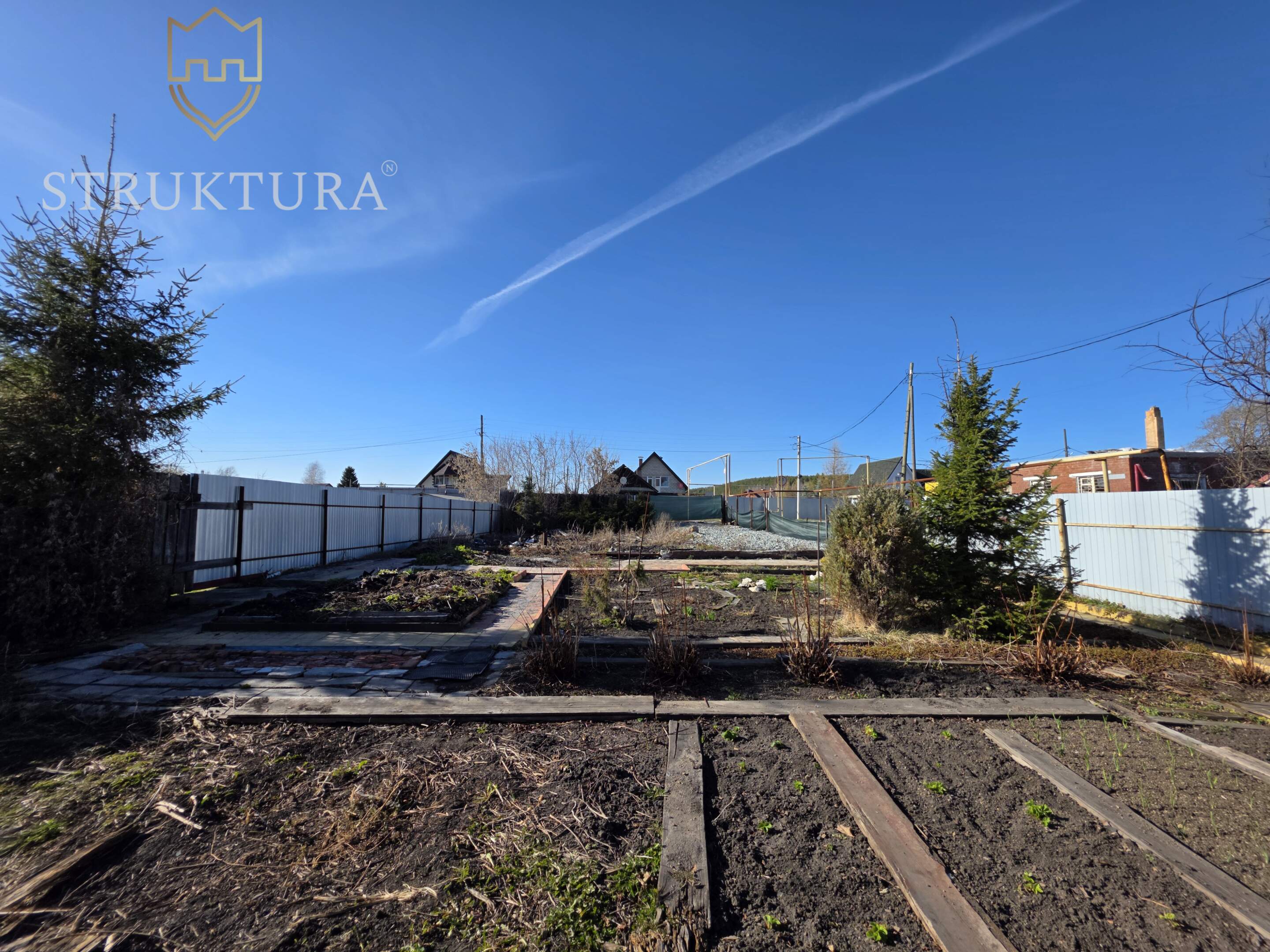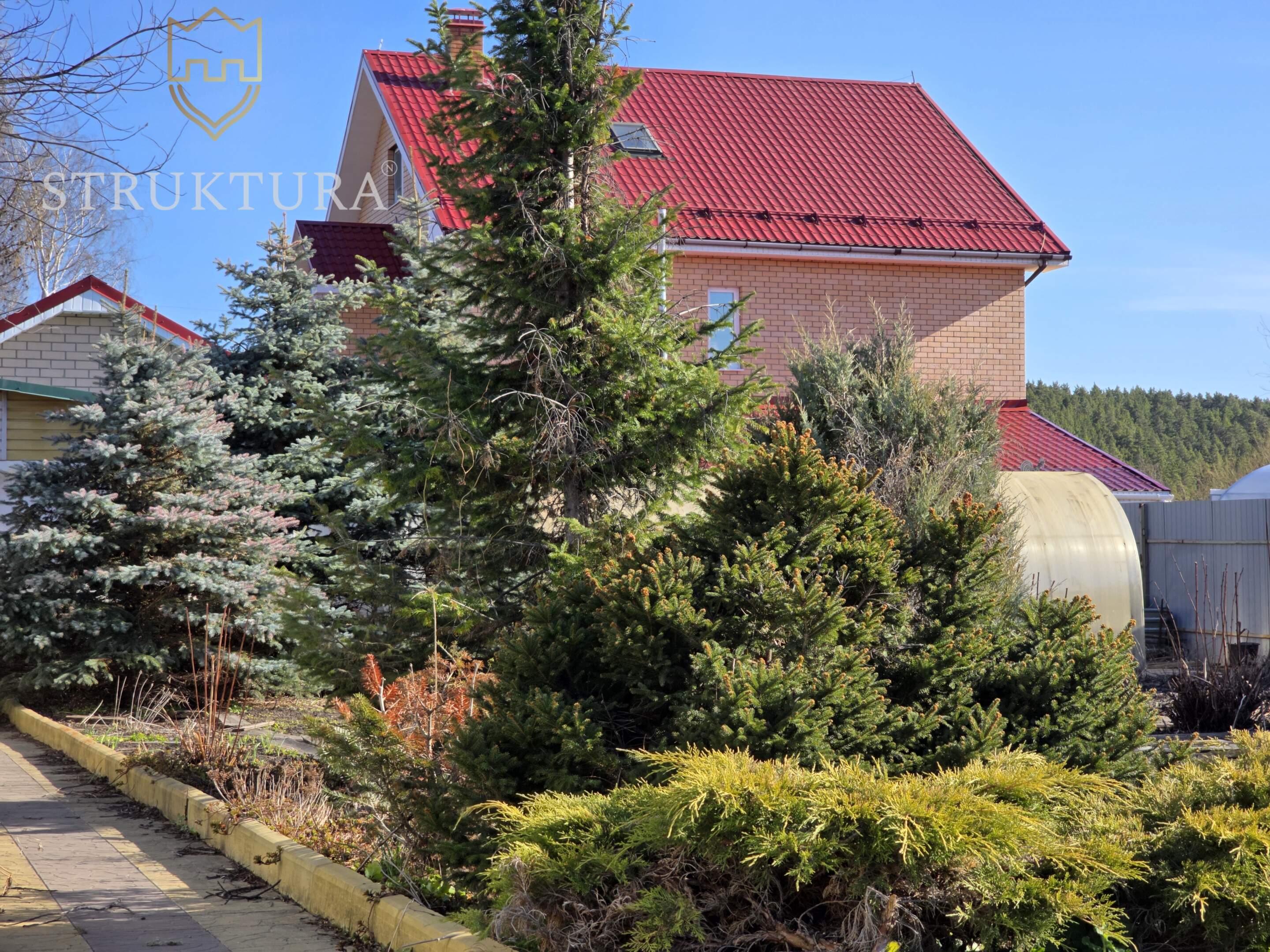 Участок с асфальтированным подъездом, угловой, рядом всего два соседа с просторными участками, дома стоят на большом расстоянии друг от друга. Территория частично огорожена (три стороны), благоустроена: тропинки ведут к грядкам и теплице, а голубые и обычные ели вместе с можжевельниками создают особый колорит. Подключено электричество, газ — у границы участка.